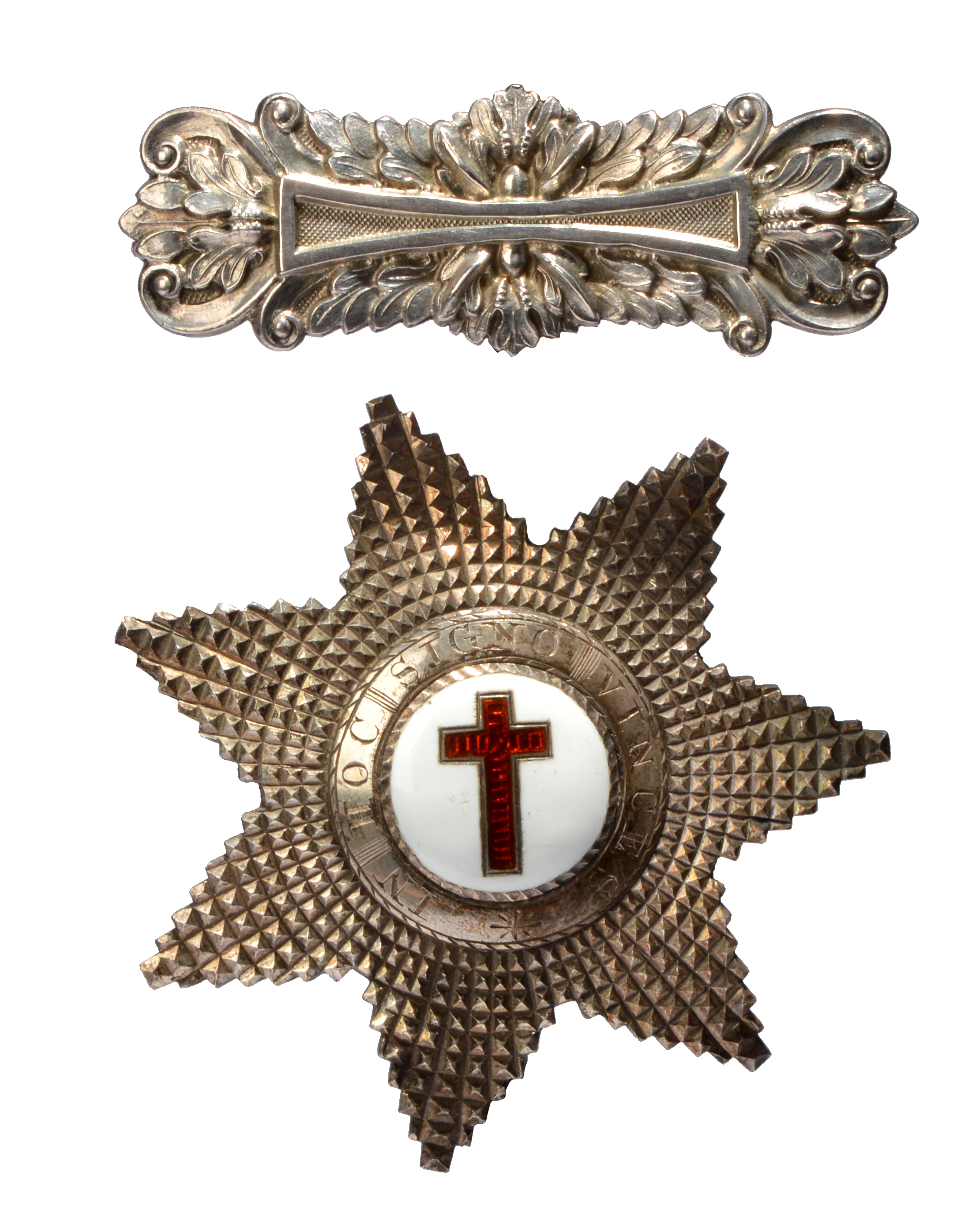 A Victorian silver military dress belt slide, of rectangular form modified by scrolls and acanthus leaves, T. B. Wilkins Ltd., Birmingham 1869; together with a masonic 'Knights Templar' silver breast badge, seven pointed star with central device of a red cross to a white ground, border engraved 'IN HOC SIGNO VINCES', Birmingham 1871. [2]