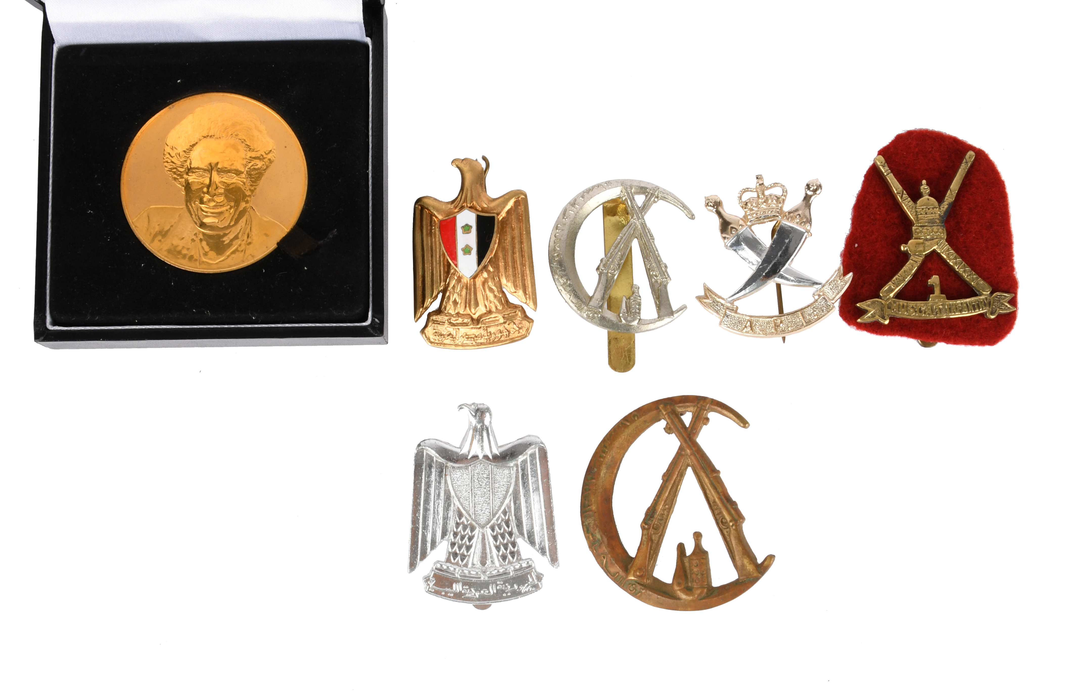 A collection of international insignia, mainly MIddle Eastern, including cap badges, rank insignia, and other items; representing: The Libyan Arab Republic, The Republic of Sudan, The Federation of South Arabia, The Syrian Arab Republic, The Republic of South Africa, and other nations. [qty]