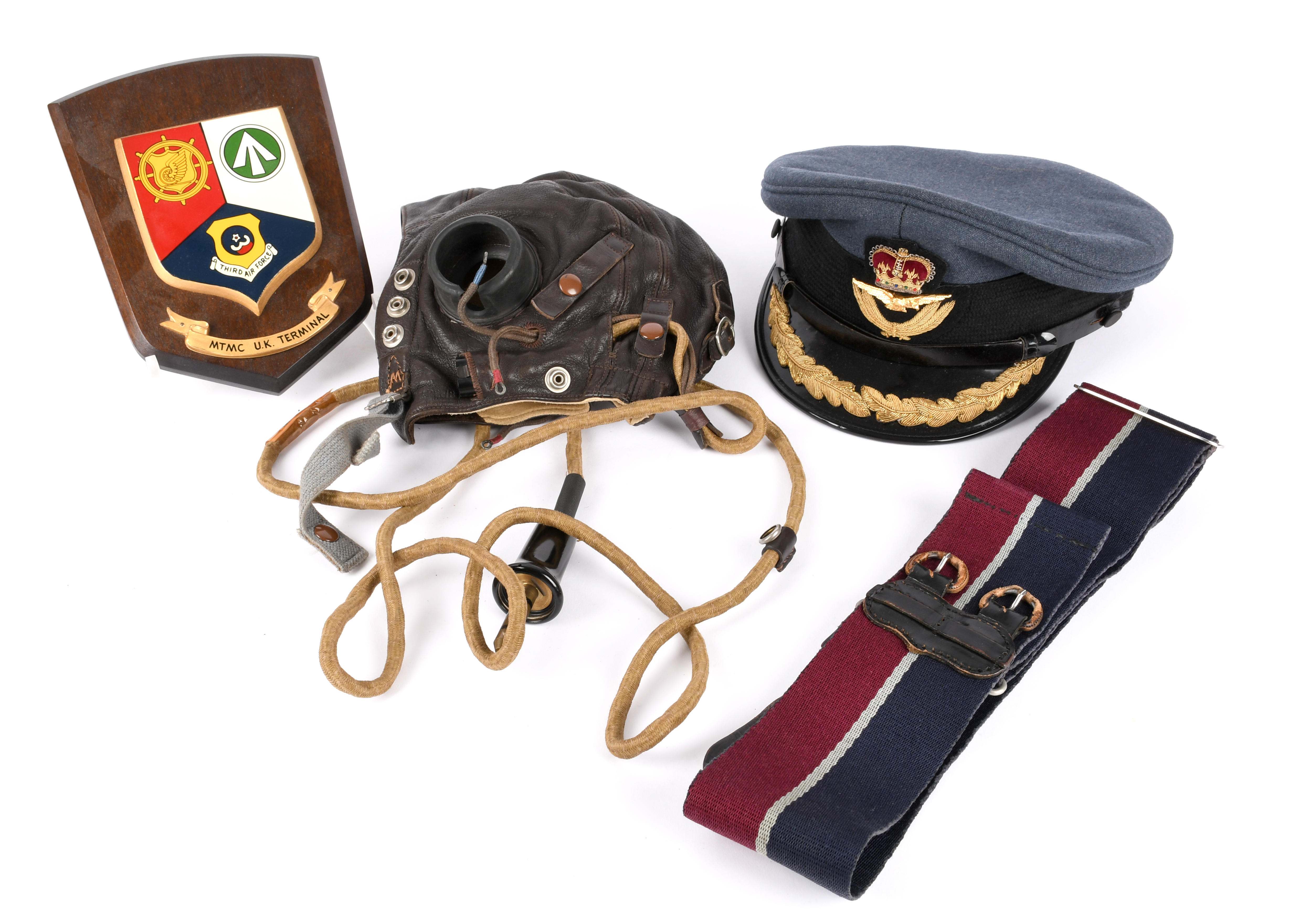 Royal Air Force: a quantity of uniform items and memorabilia, including: No 1 Service Dress: three jackets, three pairs of trousers, three caps; No 5 Mess Dress: jacket, waistcoat and trousers; a greatcoat; a side cap; a tropical jacket and trousers and various other items of tropical dress; a stable belt; a leather flying helmet; a collection of wall mounted squadron badges; and other items.