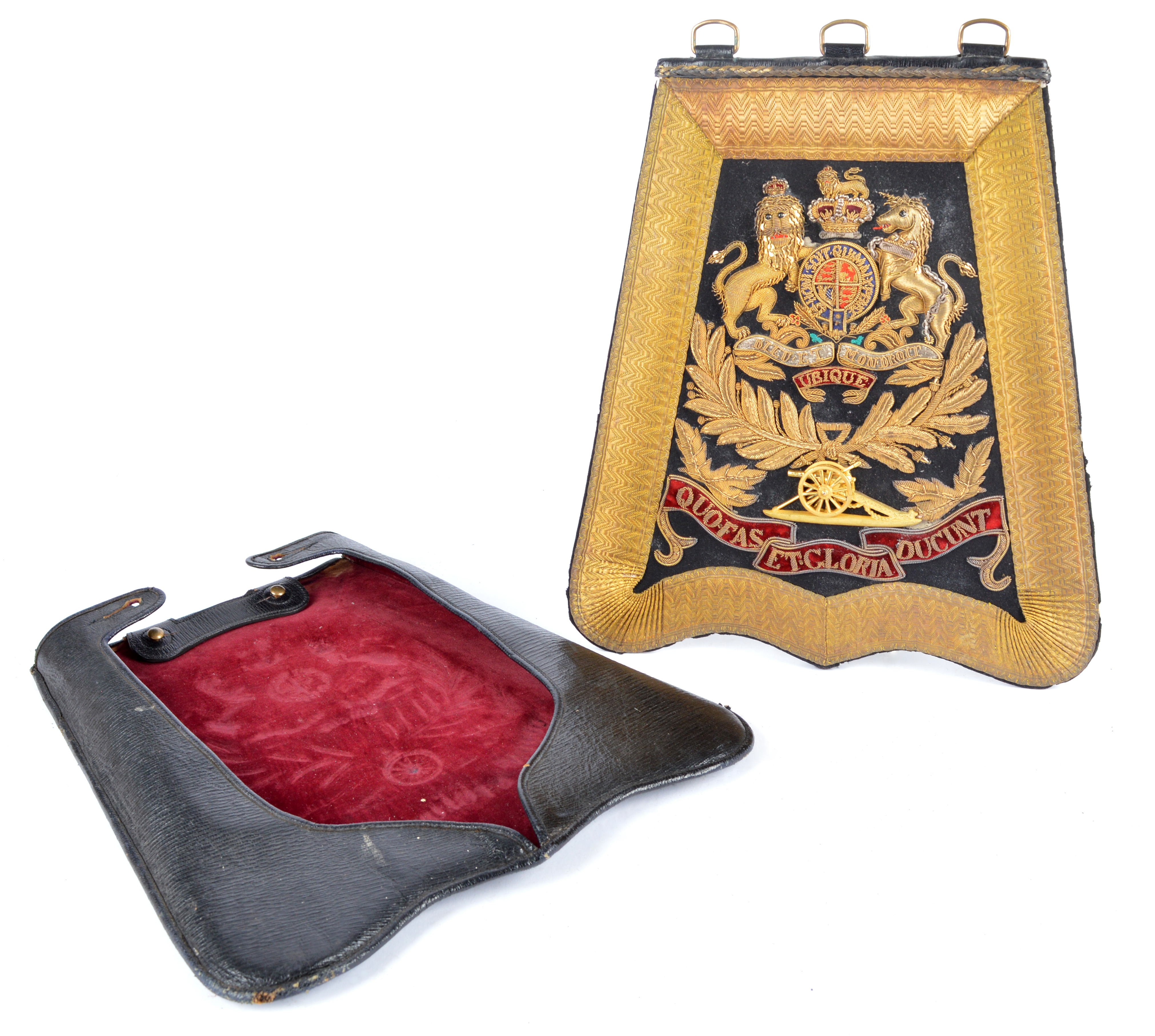 A Victorian Royal Artillery Officer's sabretache, the flap with gold lace border and embroidered Royal Arms, gilt cannon, Royal Artillery motto to cushion scrolls, complete with patent leather cover.