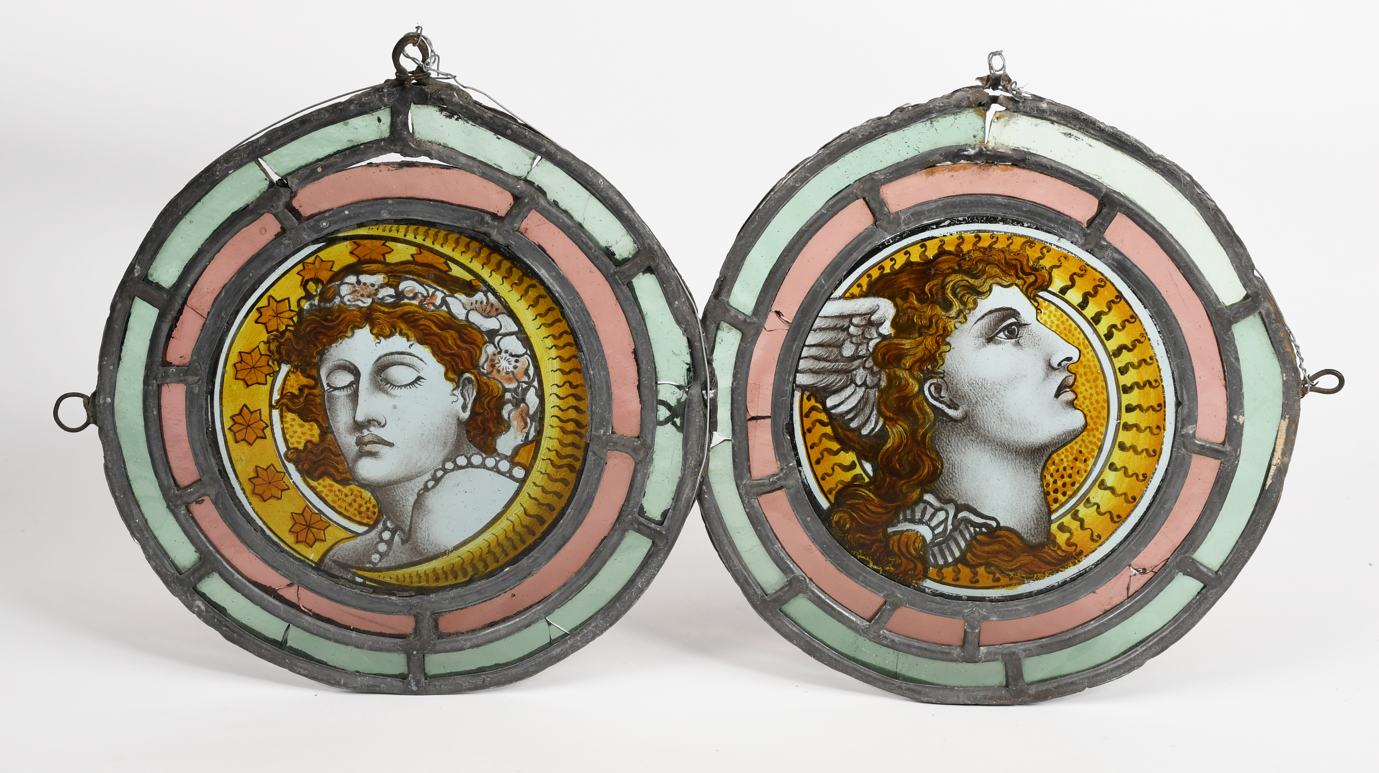 A pair of Aesthetic Movement stained glass Day and Night roundels