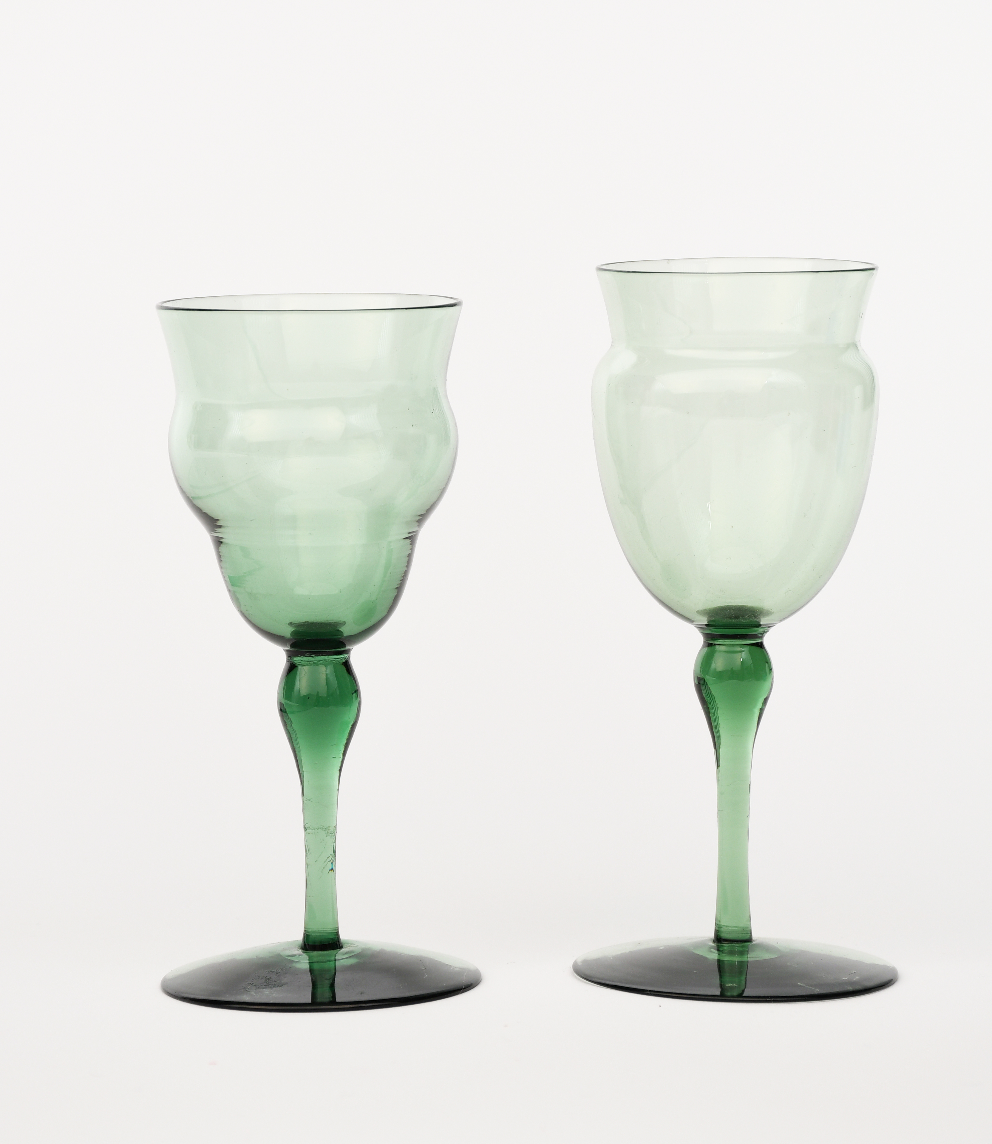 Two James Powell & Sons Whitefriars emerald green wine glasses designed by T G Jackson, each with swollen stems and swollen glass bowls, unsigned, 13cm. high (tallest), (2)