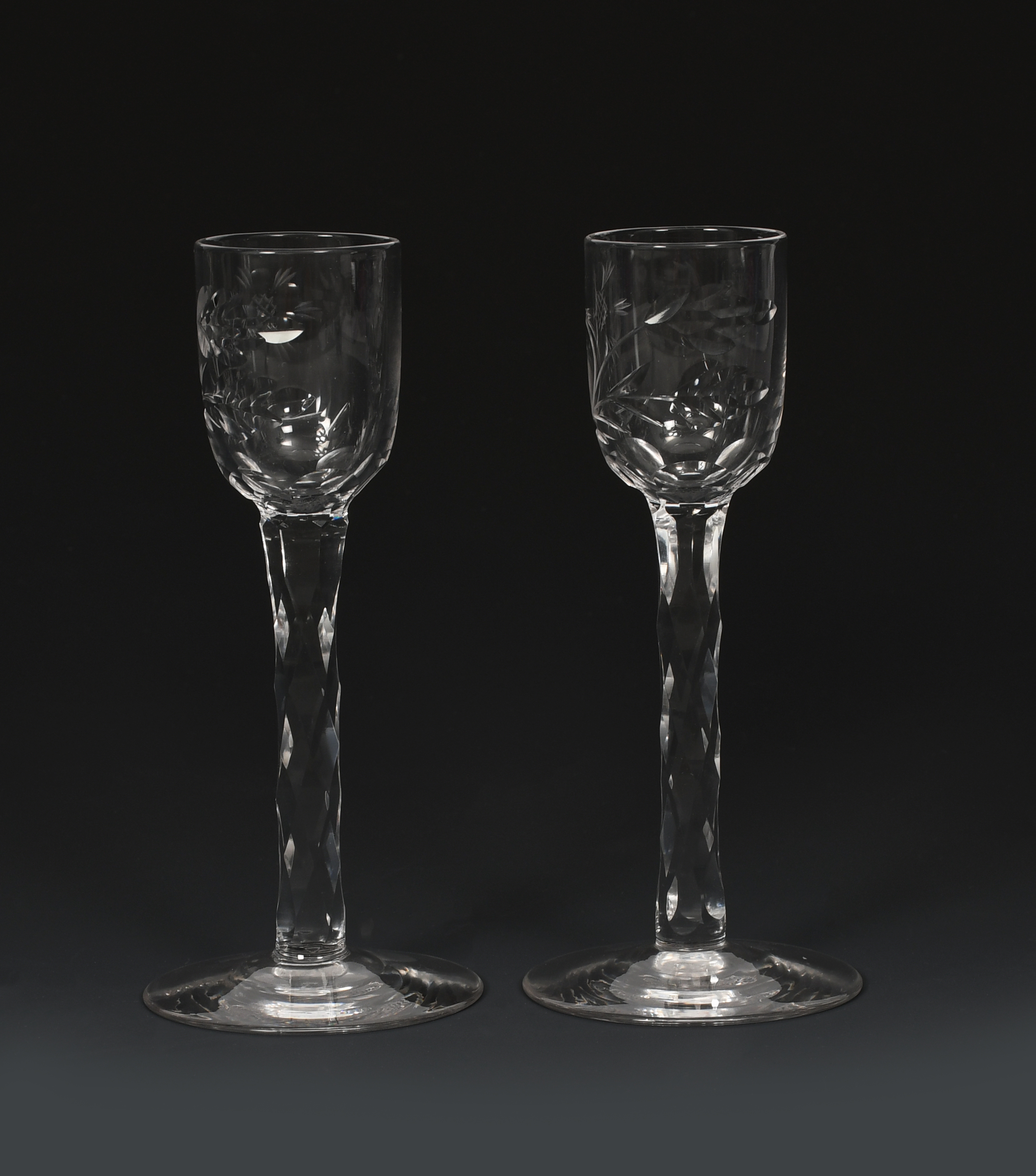 Two rare James Powell & Sons Whitefriars cut glass liqueur glasses, each cut with a stylised flower stem to the bowl, on cut stems unsigned, 14cm. high, (2)