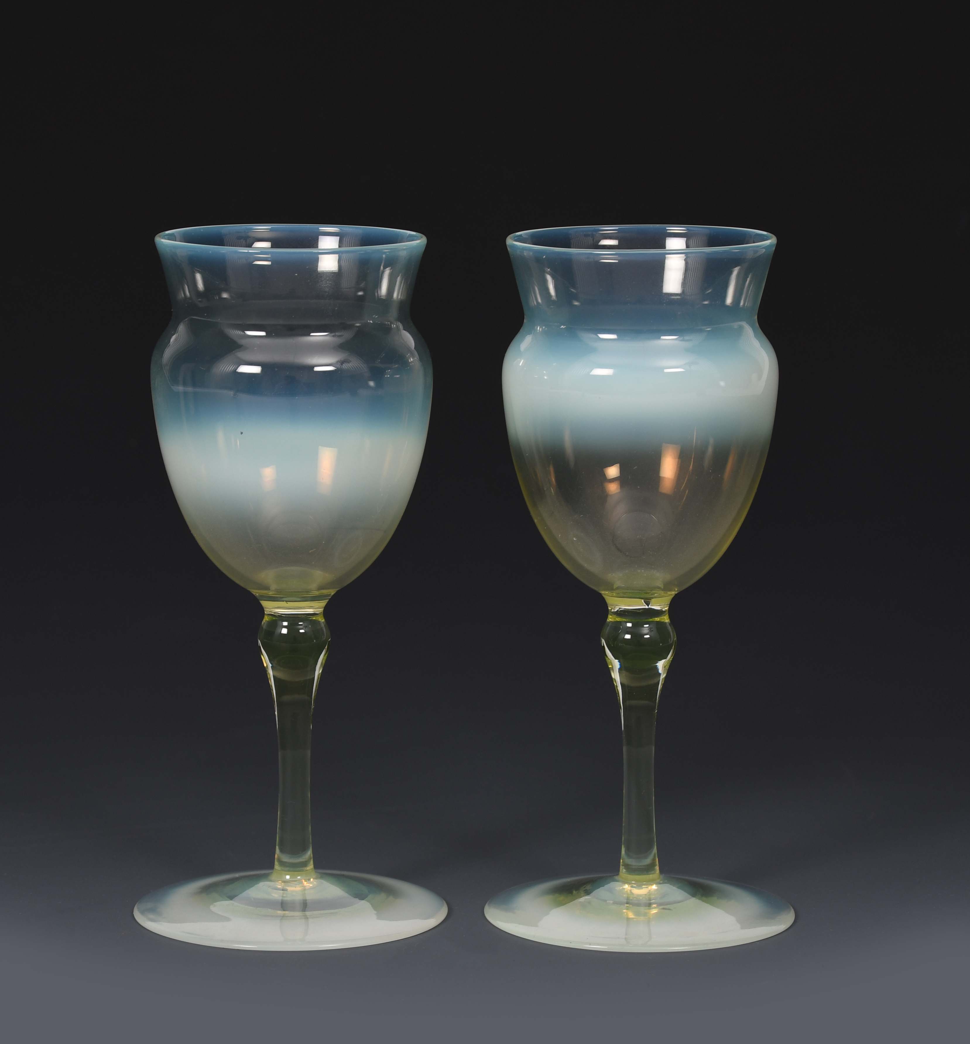 A pair of James Powell & Sons Whitefriars straw opal wine glasses designed by T G Jackson