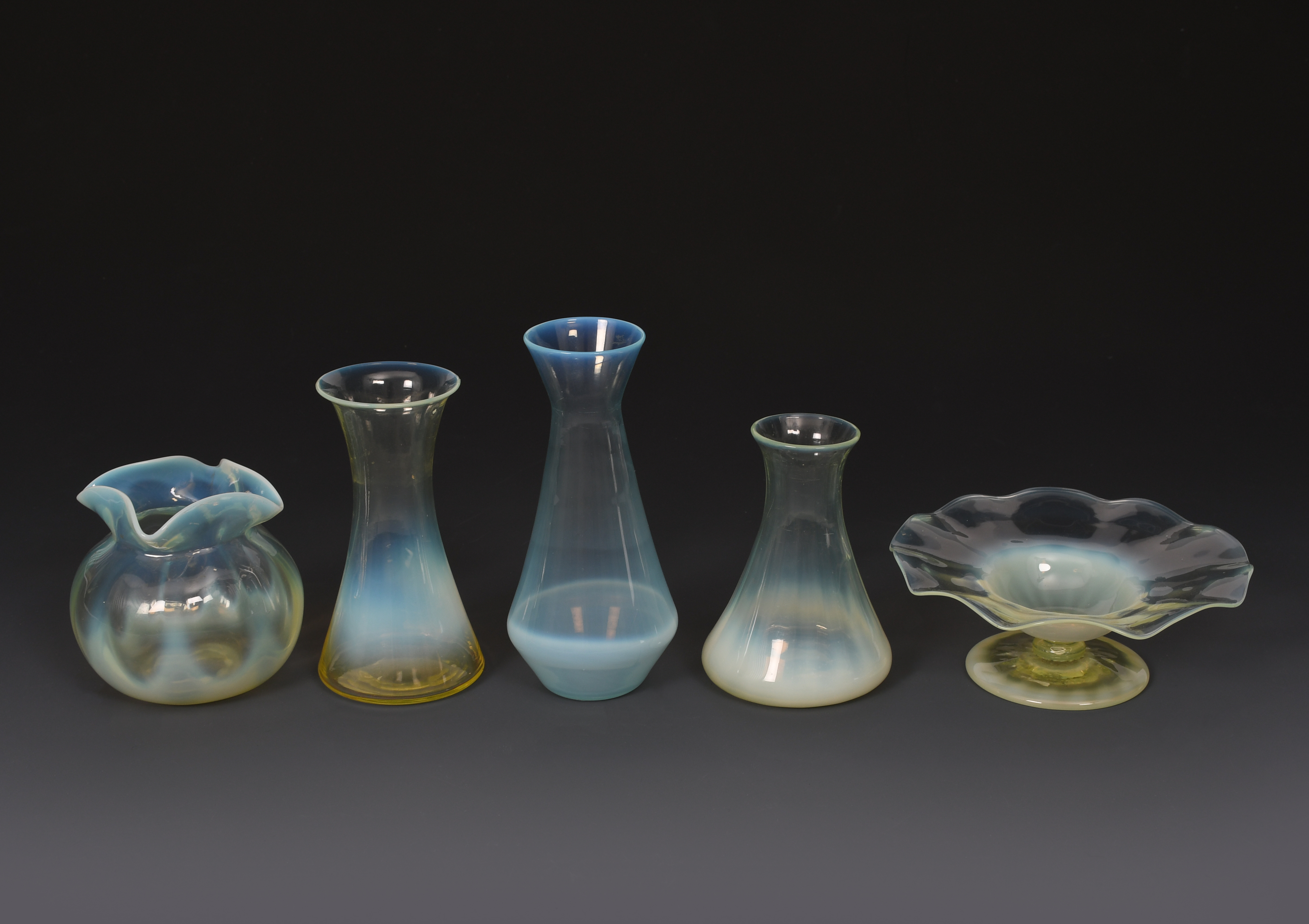 A James Powell & Sons Whitefriars blue opal glass vase, swollen form with flaring neck, two James Powell & Sons straw glass posy vases, an ovoid vase and a tazza unsigned, 13cm. high (tallest) (5)