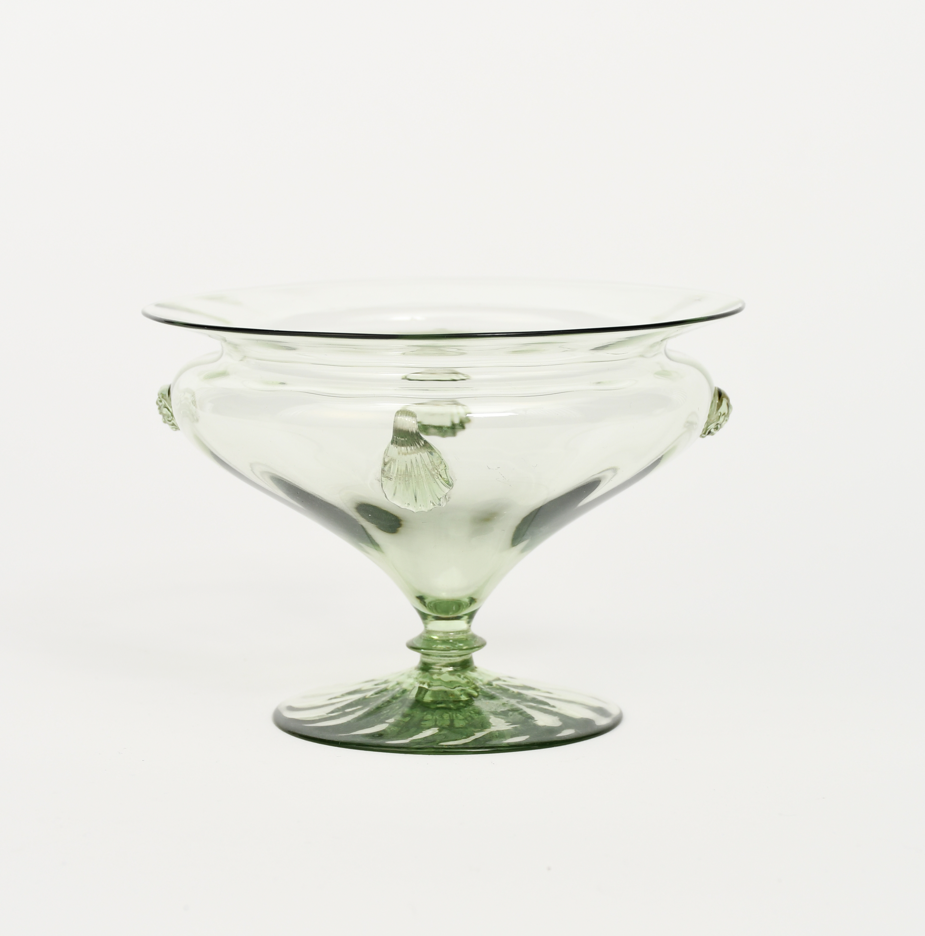 A James Powell & Sons Whitefriars sea green glass footed bowl, with applied glass shell handles and prunts, unsigned, 8.5cm. high, 12cm. diam.