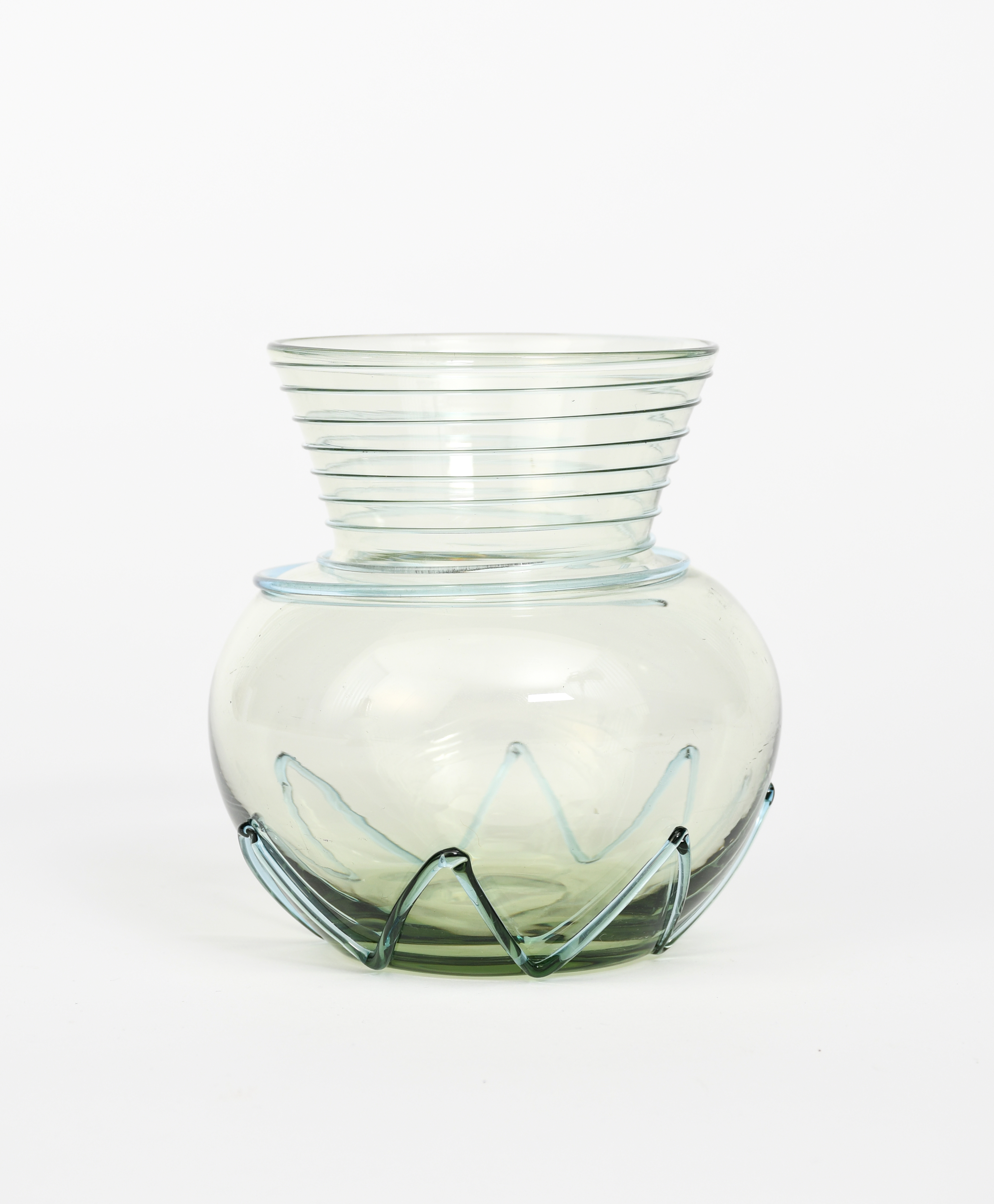 A James Powell & Sons Whitefriars Mount Carmel sea green glass vase, ovoid with flaring neck, applied with blue threaded decoration to body and neck, unsigned, 12.5cm. high