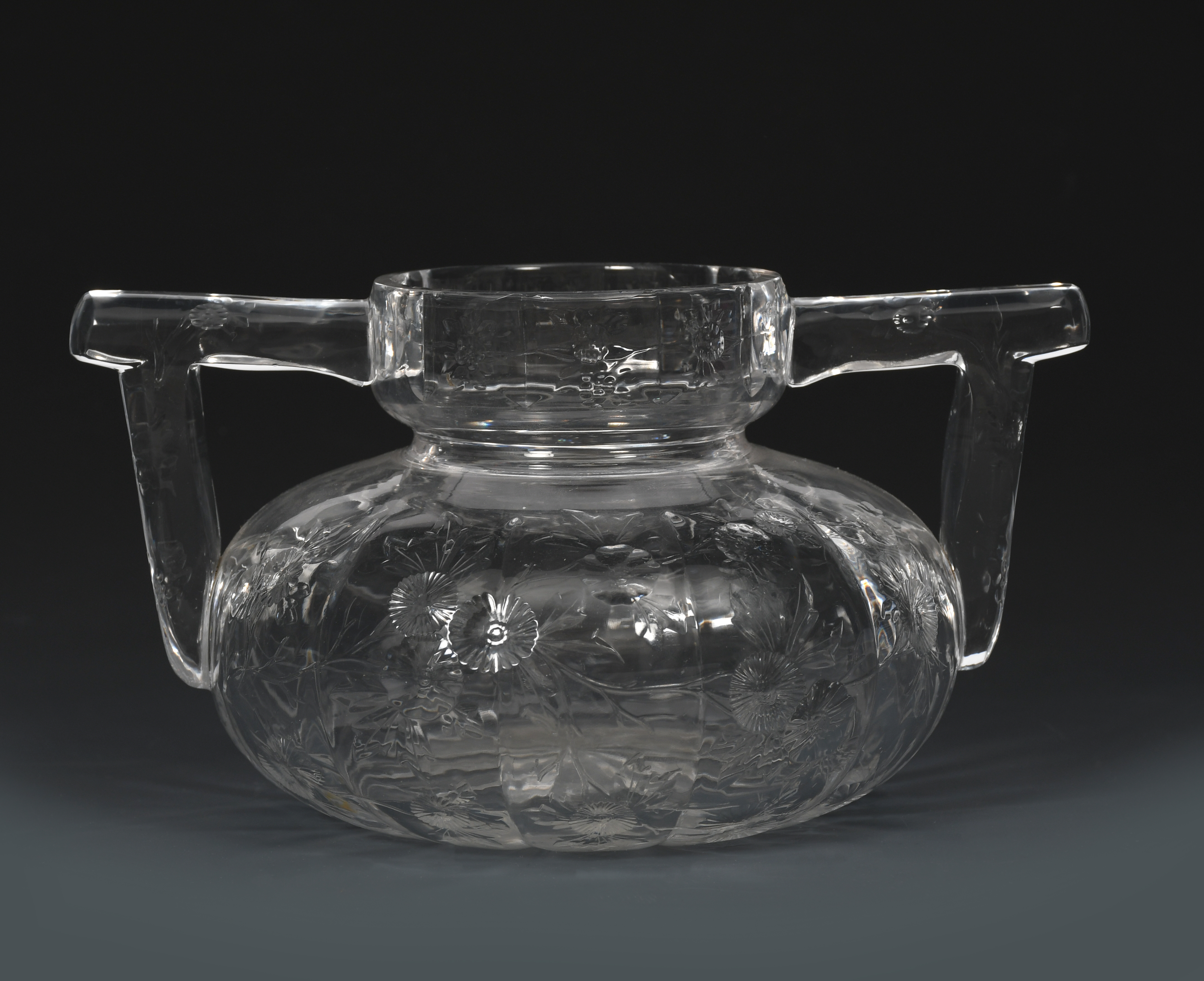 An Aesthetic Movement Stevens and Williams rock crystal glass flower vase probably cut by John Orchard, ovoid with collar rim and applied angled handles, the faceted body engraved with Japoniste prunus sprays unsigned, 10.5cm. high, 18.5cm. wide