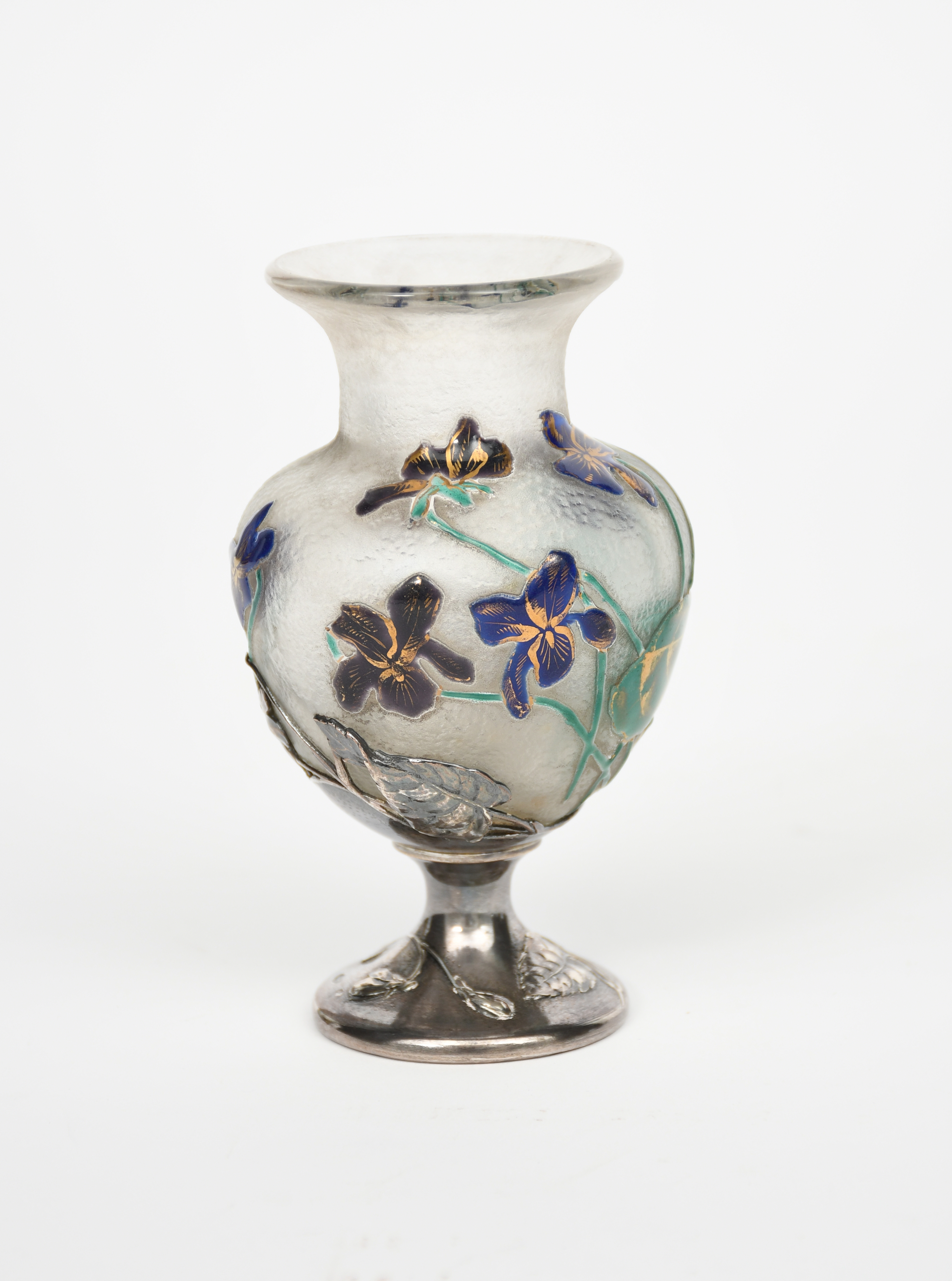 A rare Art Nouveau Guerchet silver mounted enamelled glass vase, baluster form, the silver foot cast in low relief with foliage spray rising to overlay the body with violet flower stems, the glass body enamelled with similar violets in blue and green, highlighted in gilt on a textured ground stamped Guerchet to foot, 12cm. high