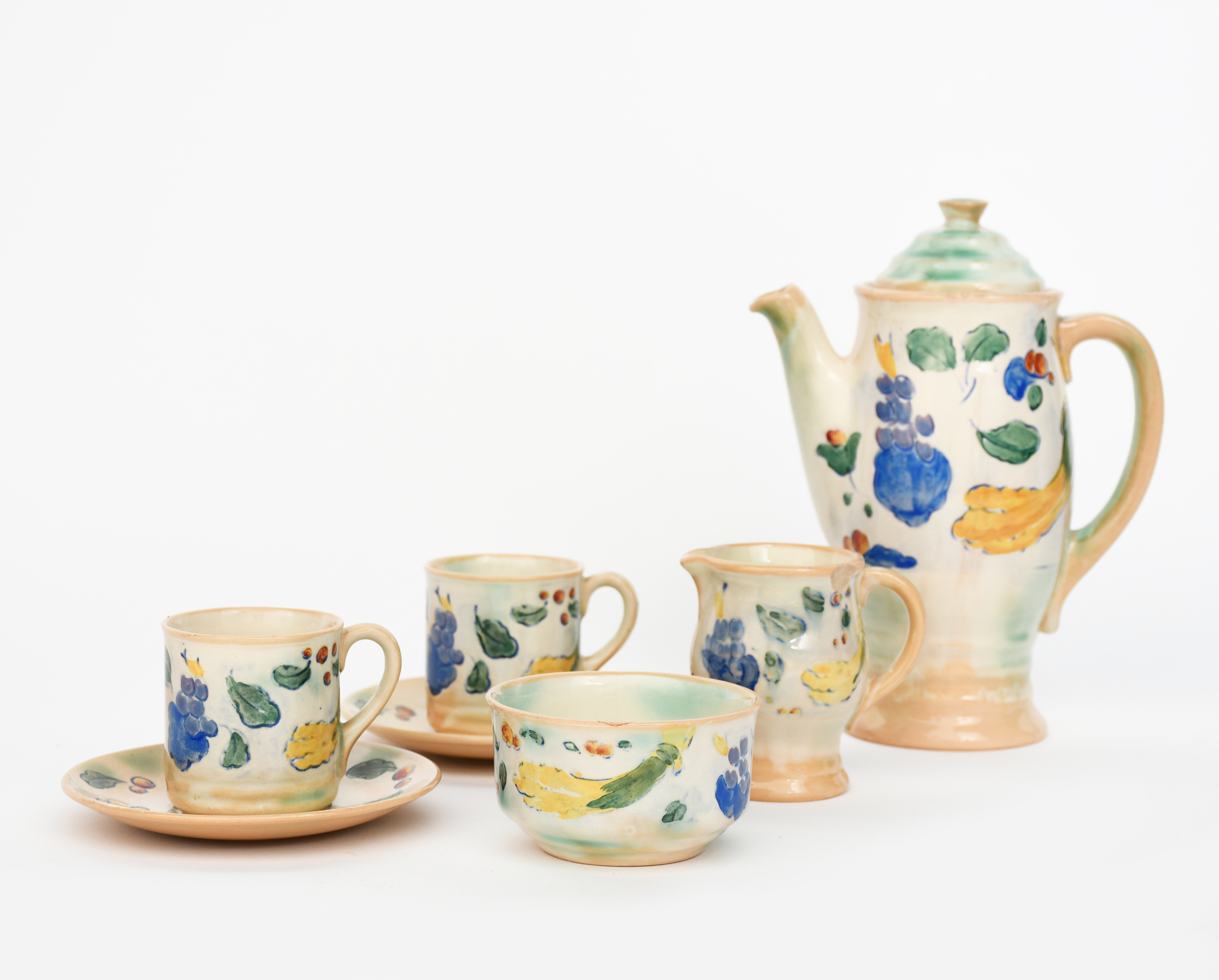 A Royal Doulton 'Brangwyn Ware' Harvest coffee set for two designed by Frank Brangwyn, decorated with a band of grape, fruit and a sheaf of corn in colours on a pale green and cream ground, comprising coffee pot and cover, milk-jug and sugar basin, two cups and saucers printed factory marks, minor damages, 19.5cm. high (coffee pot), (8)
