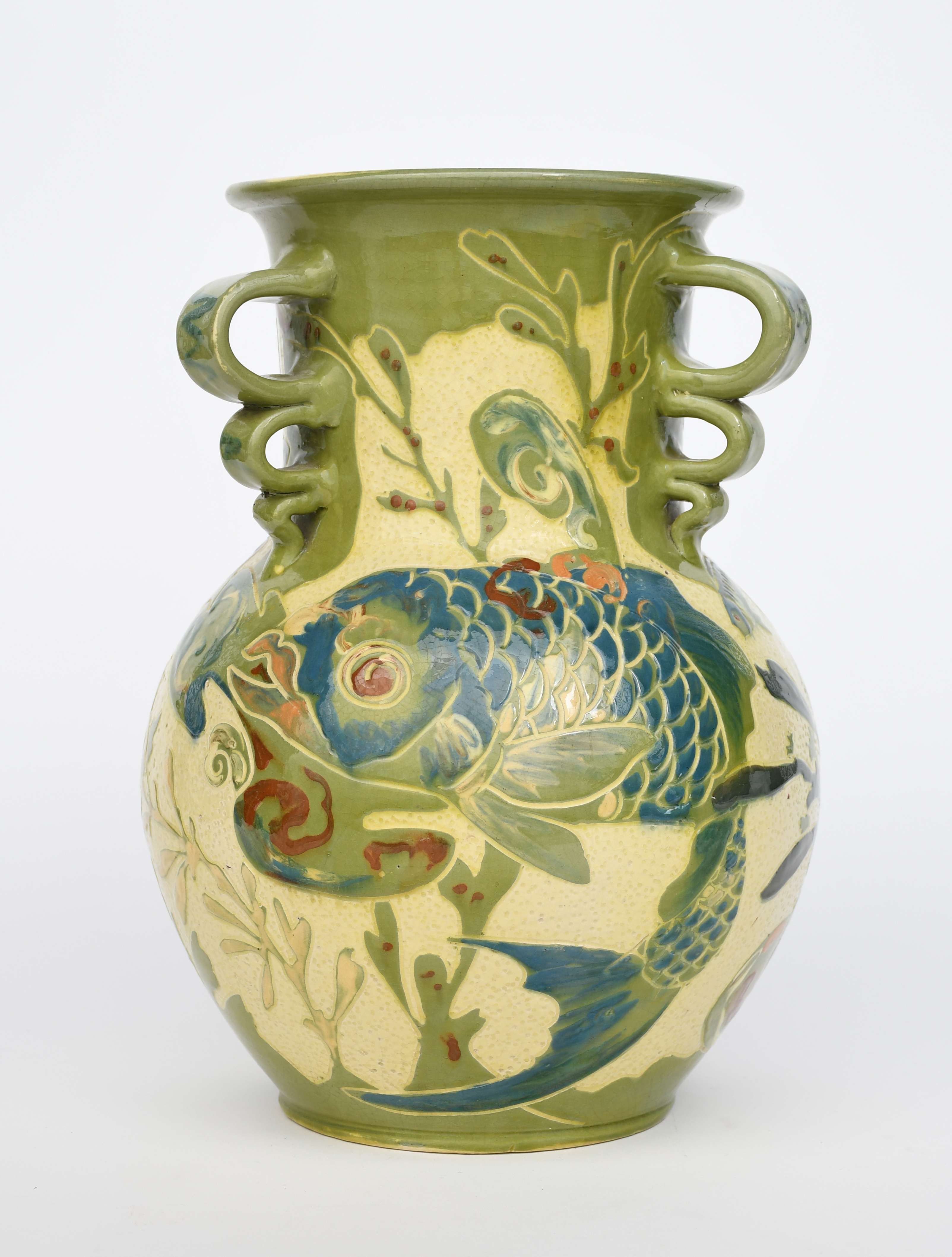A large C H Brannam Pottery vase by James Dewdney, dated 1894, ovoid with cylindrical neck, the neck applied with three looped handles to the neck, the body painted in slip with large scaly fish swimming amongst waterweed, in green, blue and brown on a cream ground incised marks, professional restoration, 34cm. high