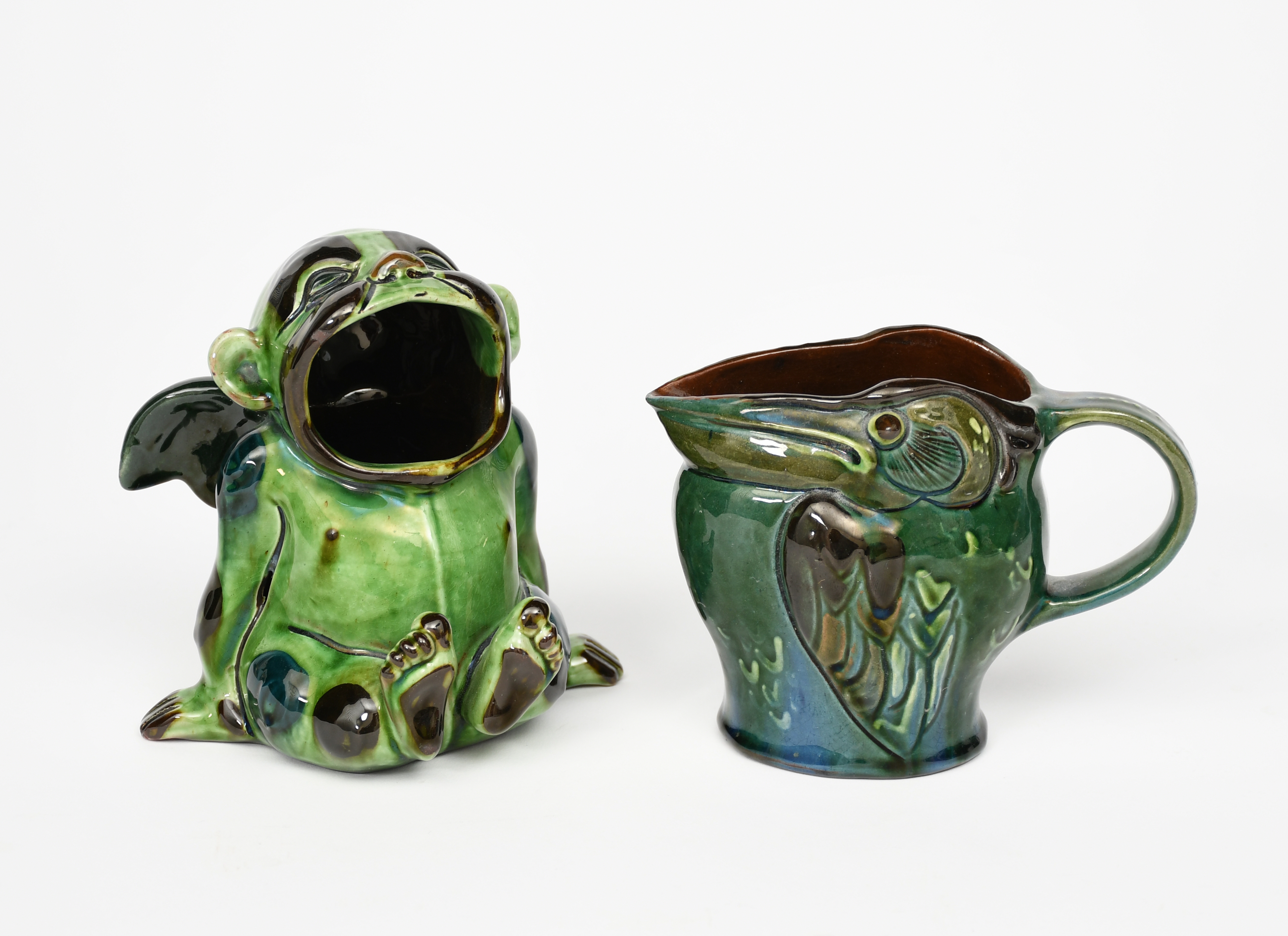 A rare C H Brannam grotesque spoon warmer, modelled as a seated, winged figure, glazed green and ochre, and a Brannam pottery jug modelled as a bird, incised C H Brannum, Barum and regd mark, incised artist monogram, 13.5cm. high (2)