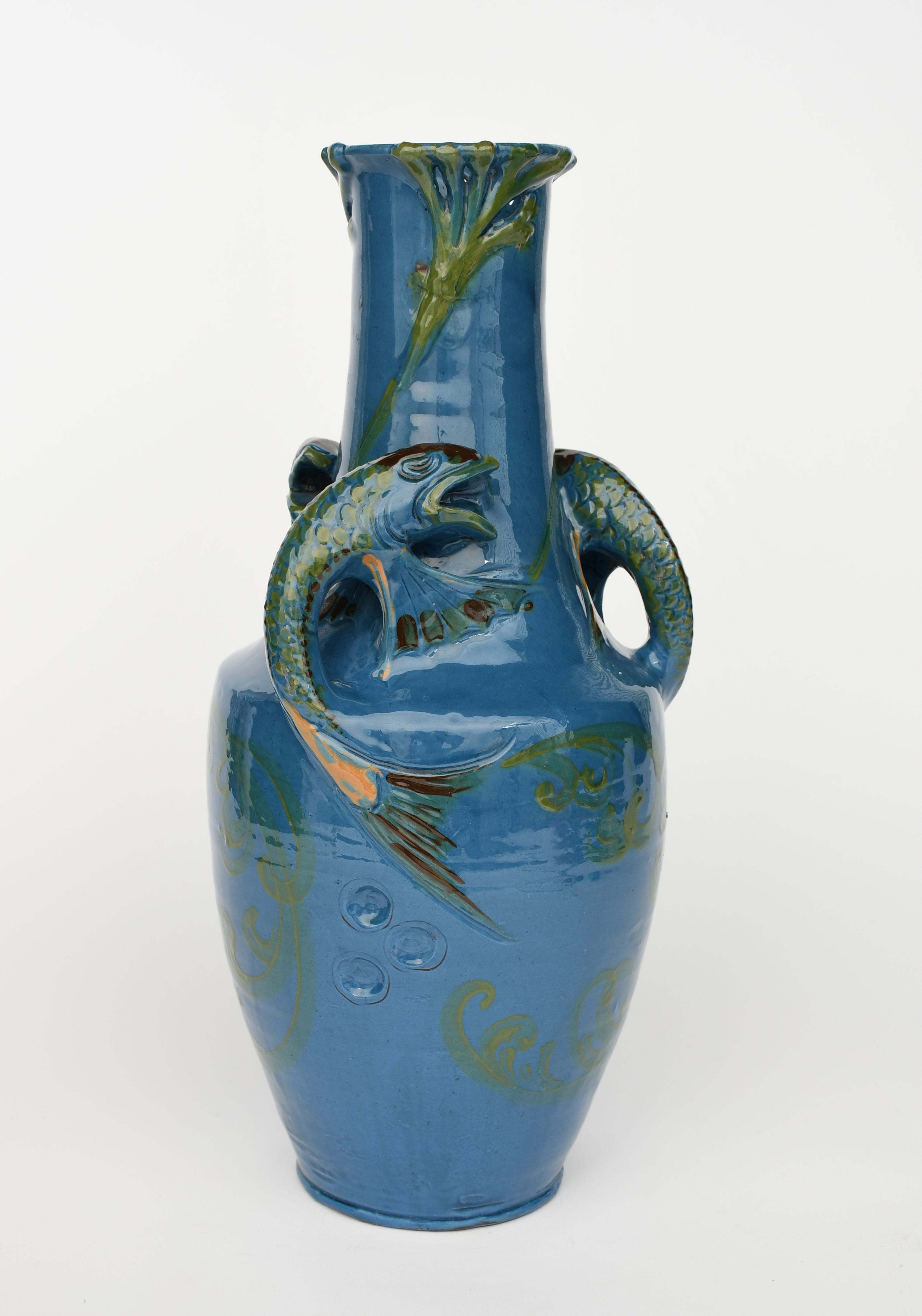 A tall C H Brannam pottery vase, shouldered form with tapering neck and everted rim, modelled in relief with three leaping scaly fish to the shoulder, the top rim pierced with waterweed sprays, in green, brown and ochre on a blue ground impressed factory marks, restored neck, 49.5cm. high