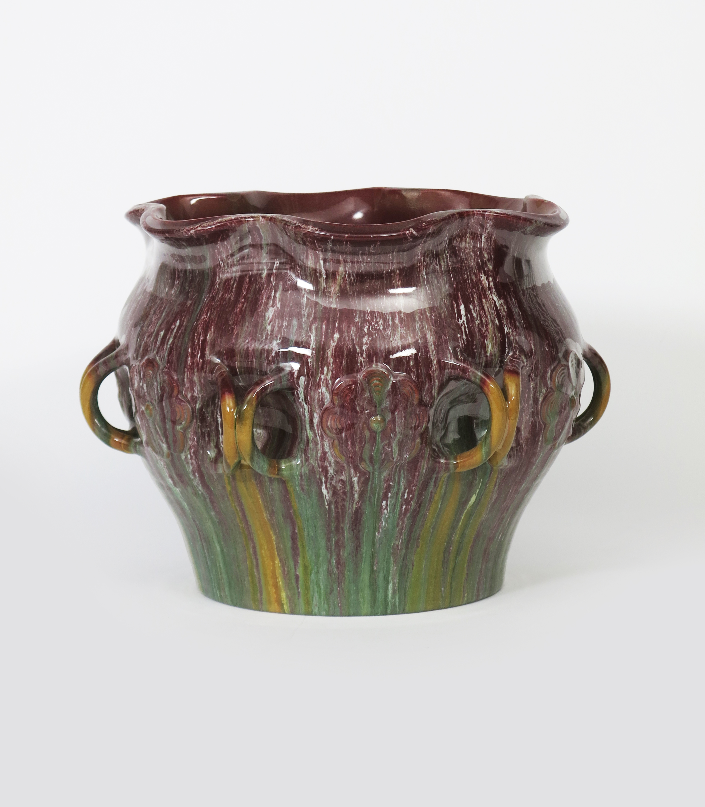 A large Linthorpe Pottery vase with loop handles designed by Dr Christopher Dresser