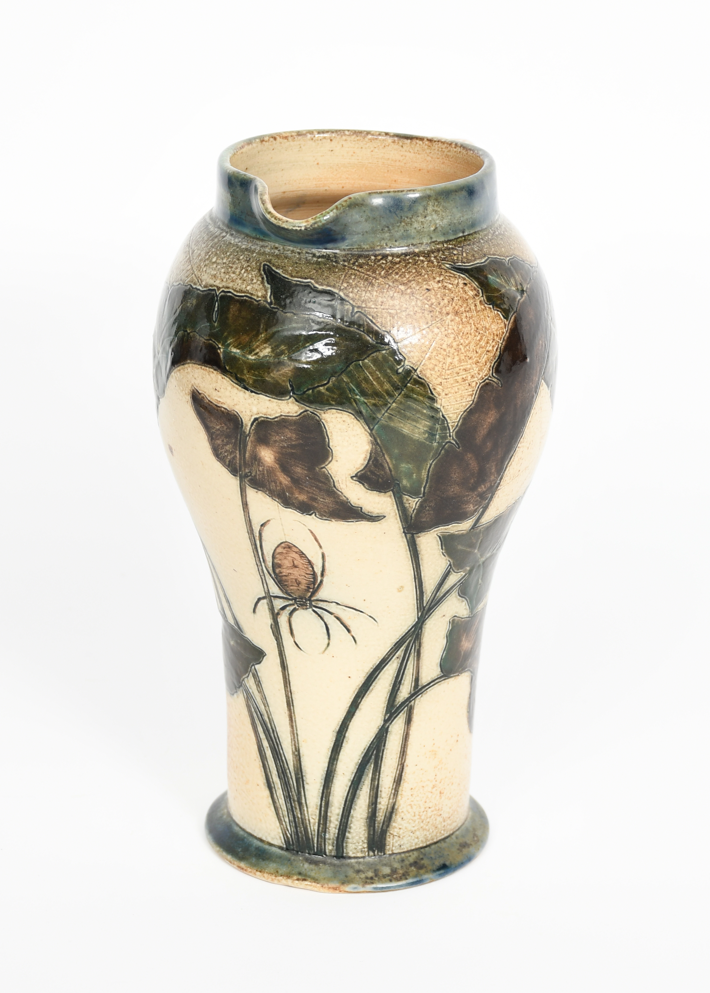 A Martin Brothers stoneware jug by Robert Wallace Martin, swollen cylindrical form, incised with a spider hanging from a large leaf by a thread, two web's incised in the body, glazed in shades of green and brown on a buff ground, incised R W Martin London & Southall, professional restoration to top rim, firing cracks to handle, 22cm. high
