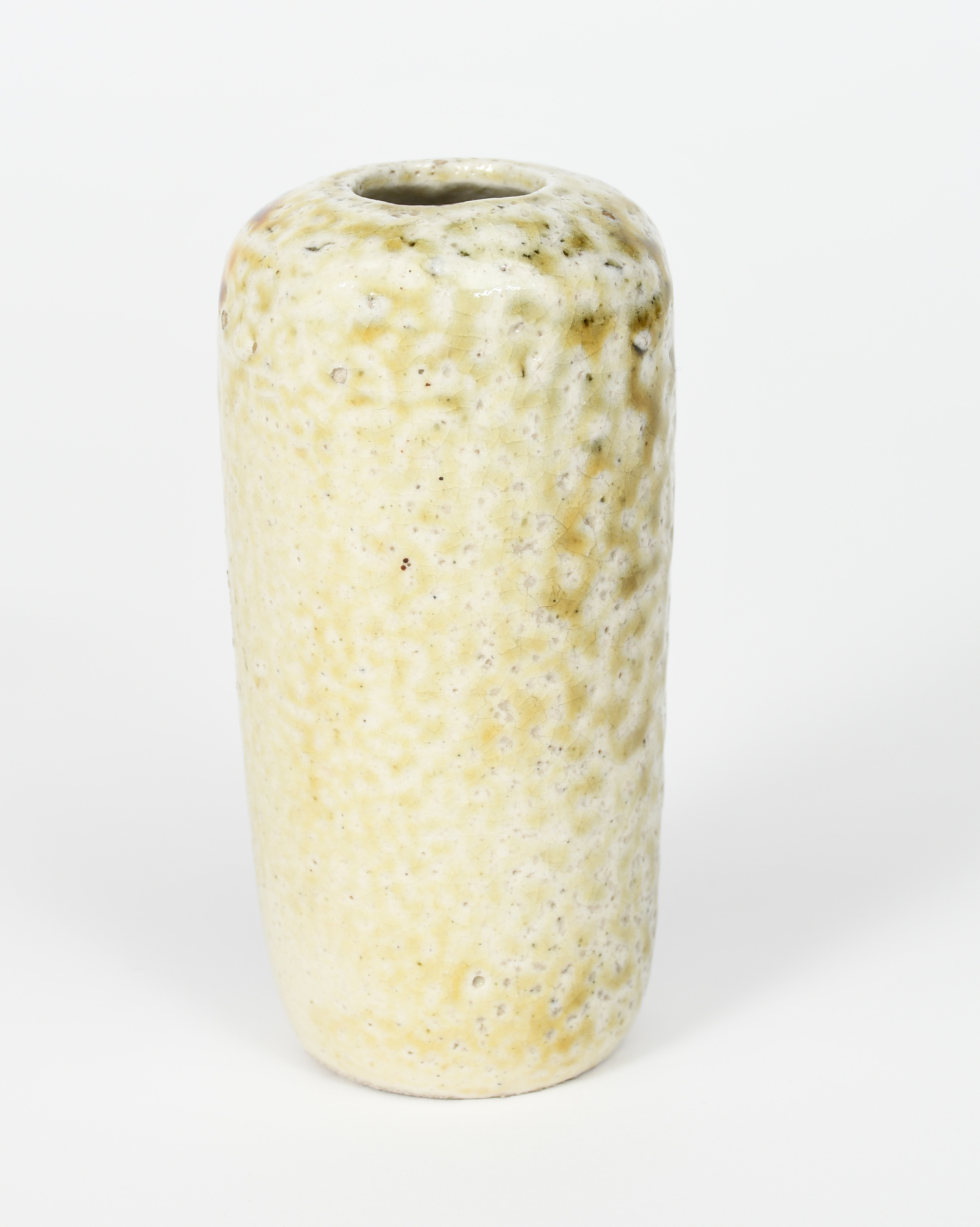 A Martin Brothers stoneware gourd vase, shouldered cylindrical form, covered in a pitted and pooled oatmeal glaze, incised NI EXT to base, 12cm. high