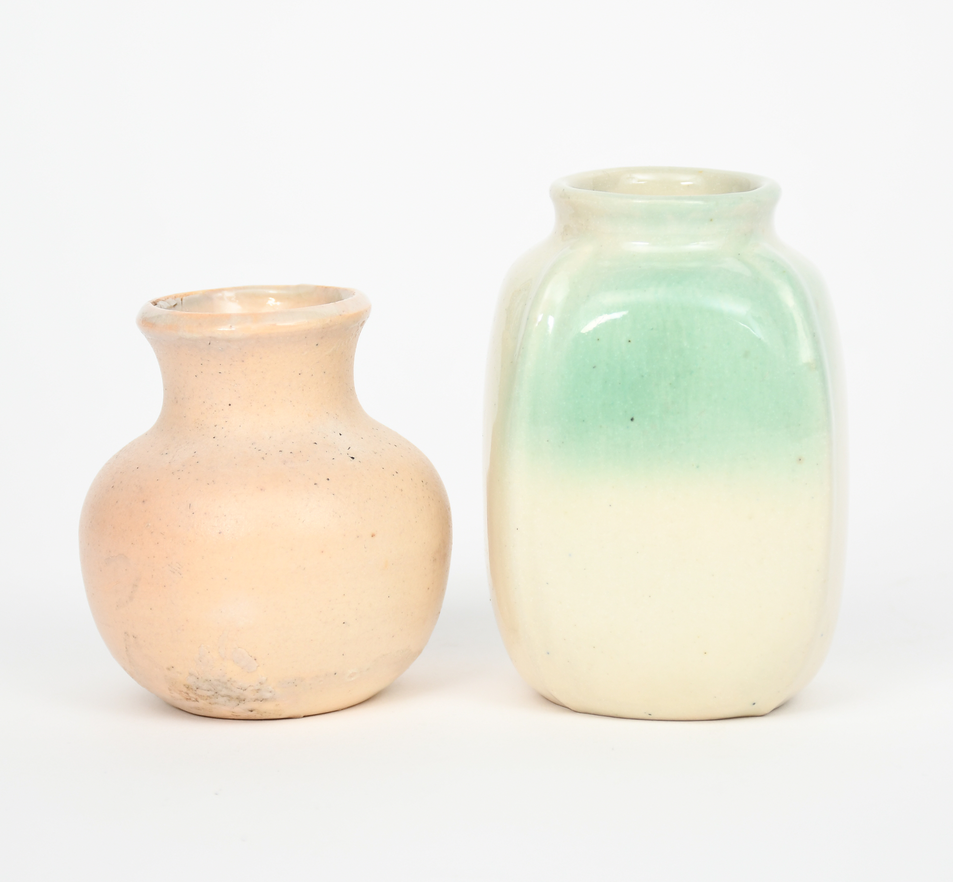 A Martin Brothers stoneware gourd vase, shouldered ribbed form, covered in a cream glaze with mint green splashes, and another ovoid vase covered in a pitted mushroom glaze unsigned, main vase number 2, 8.3cm. high, (2)