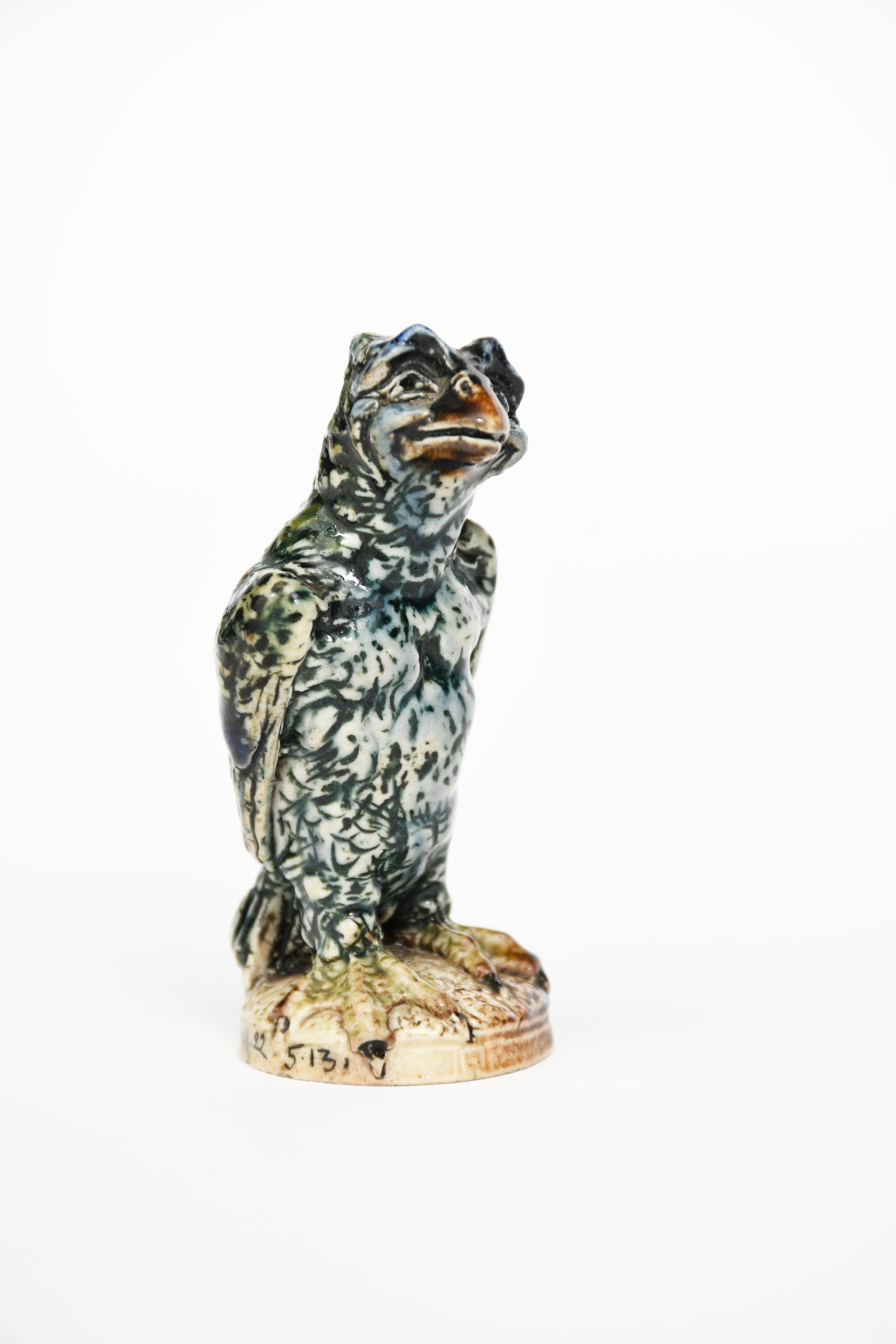A rare Martin Brothers stoneware miniature bird, dated 1913, modelled standing with webbed feet, wings tucked behind its back, glazed in shades of green and ochre, highlighted with blue incised to base R W Martin Bros London & Southall, 22.5.13, minor glaze flake to eyebrow, 7cm. high