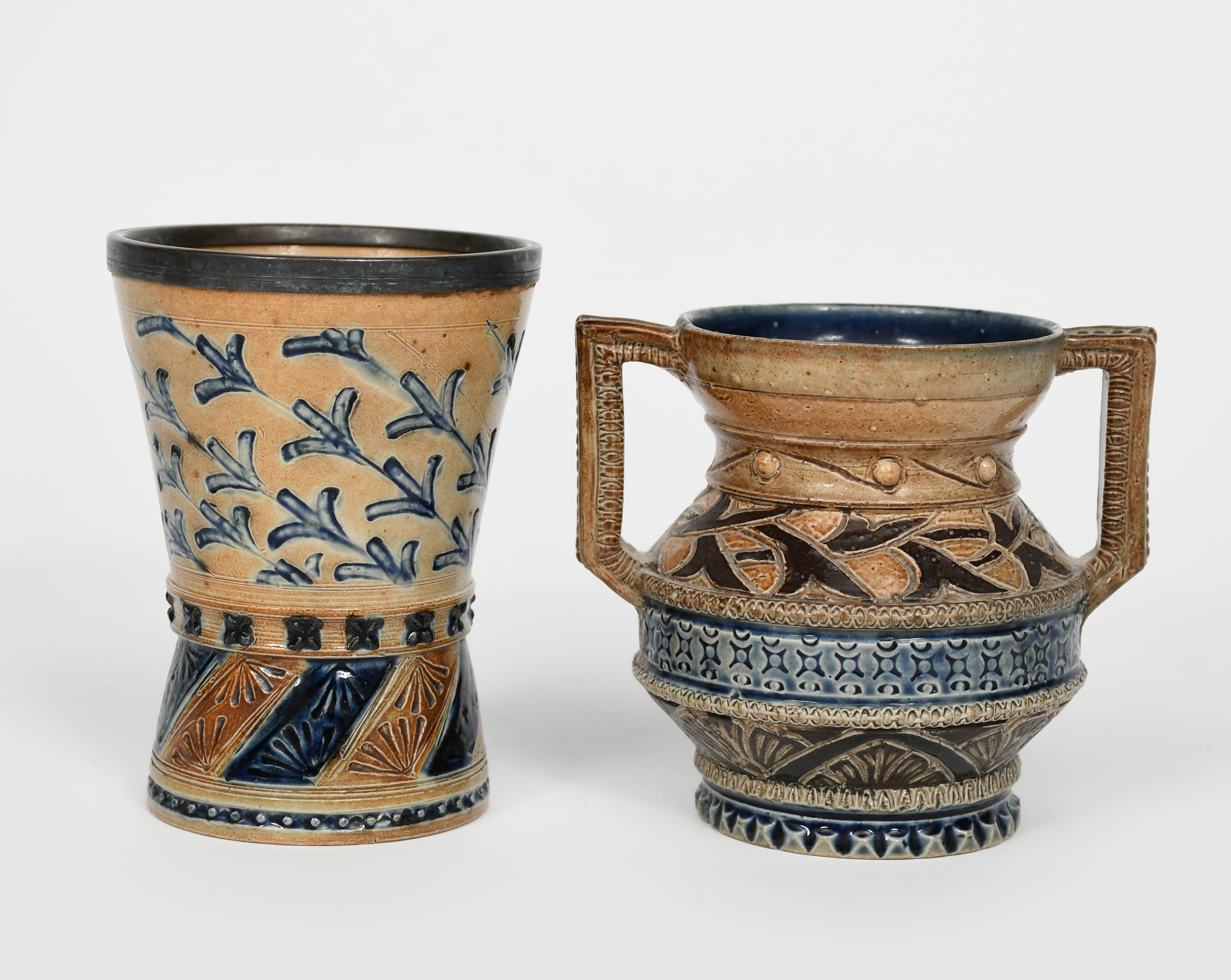 An early Martin Brothers stoneware beaker vase by Robert Wallace Martin, waisted cylindrical form with applied silver rim, incised and impressed with bands of stylised foliage, in brown and blue on a buff ground, and another early Martin Brothers stoneware twin-handled vase by Robert Wallace Martin, dated 1875, beaker vase incised RWM 23, 71/3 Fulham, stamped hallmarks, Edward Charles Brown London 1873, 12cm. high, (2)
