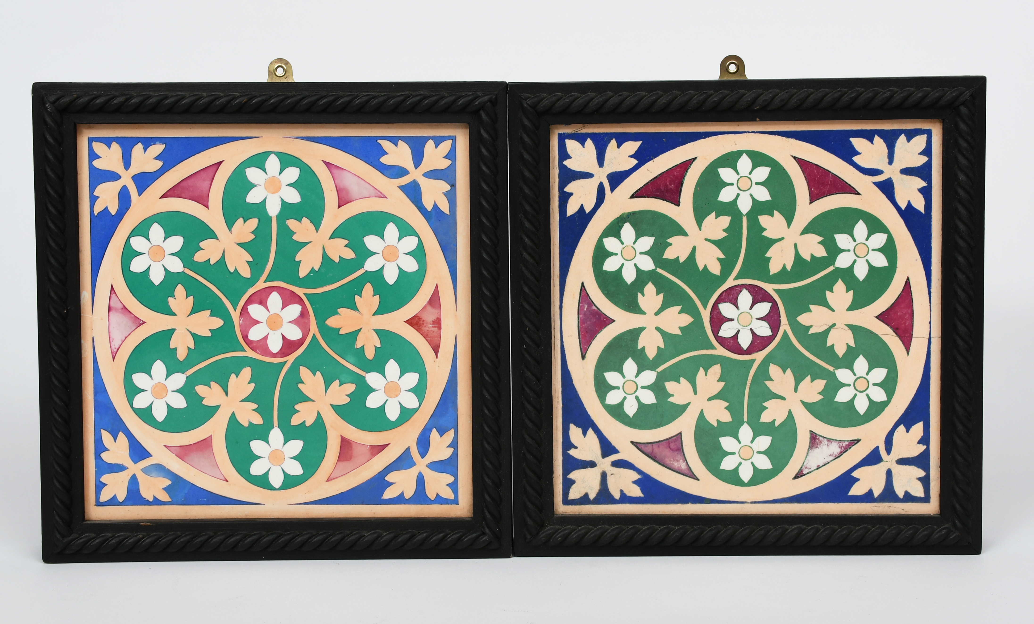 A pair of Minton's tiles designed by Augustus Welby Northmore Pugin, each decorated with a radiating floral roundel in shades of blue, green, claret and salmon pink, in modern ebonised wood frames, impressed grid mark to back, hairline to one, 20cm. square (tiles), (2)
