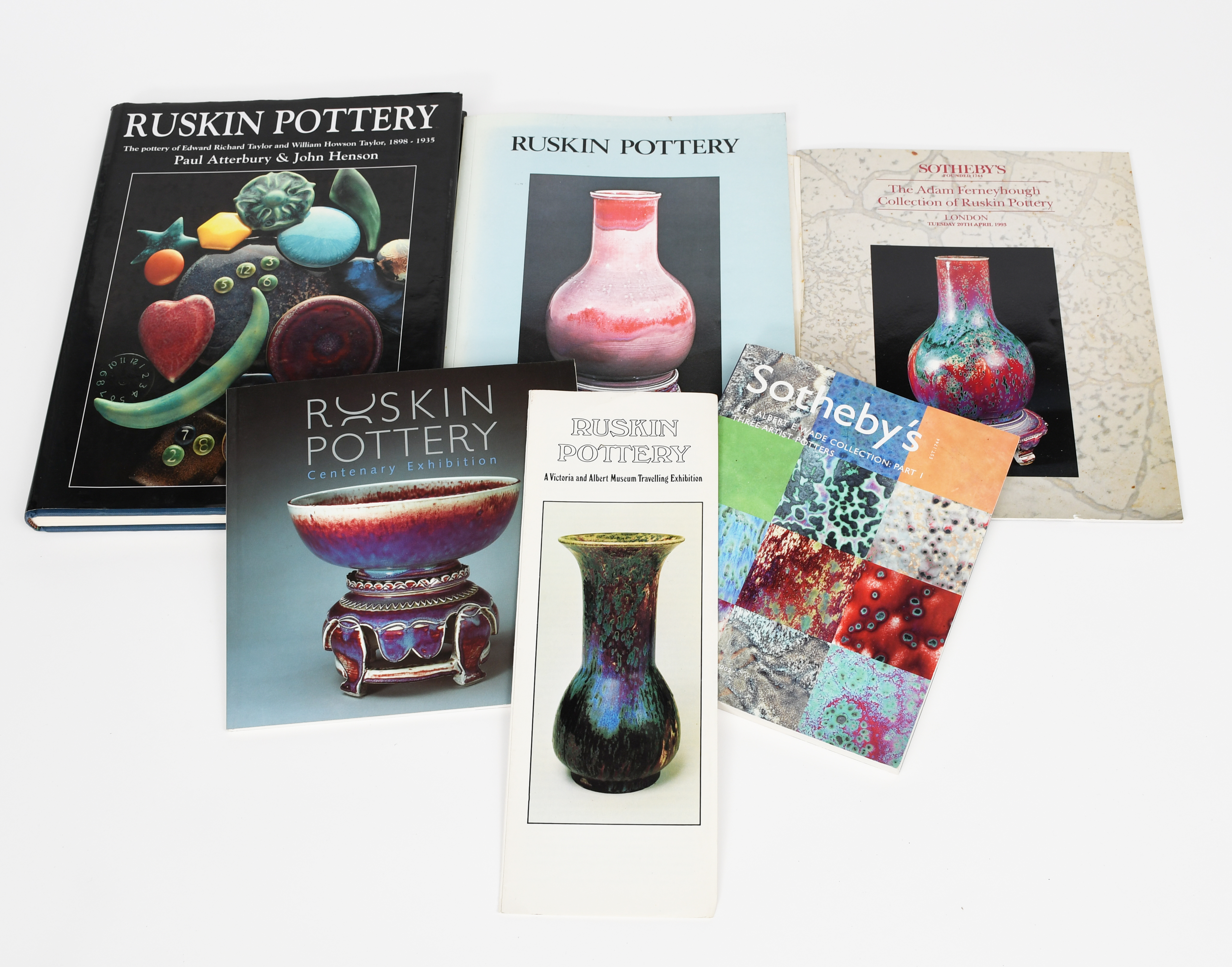 Four reference works on Ruskin Pottery, comprising Ruskin Pottery A selection from the Ferneyhough Collection, Ruskin Pottery by Paul Atterbury and John Henson, Ruskin Pottery V&A travelling exhibition leaflet and The Albert Wade Collection Part 1, Sotheby's catalogue 2nd May 2002, (4)