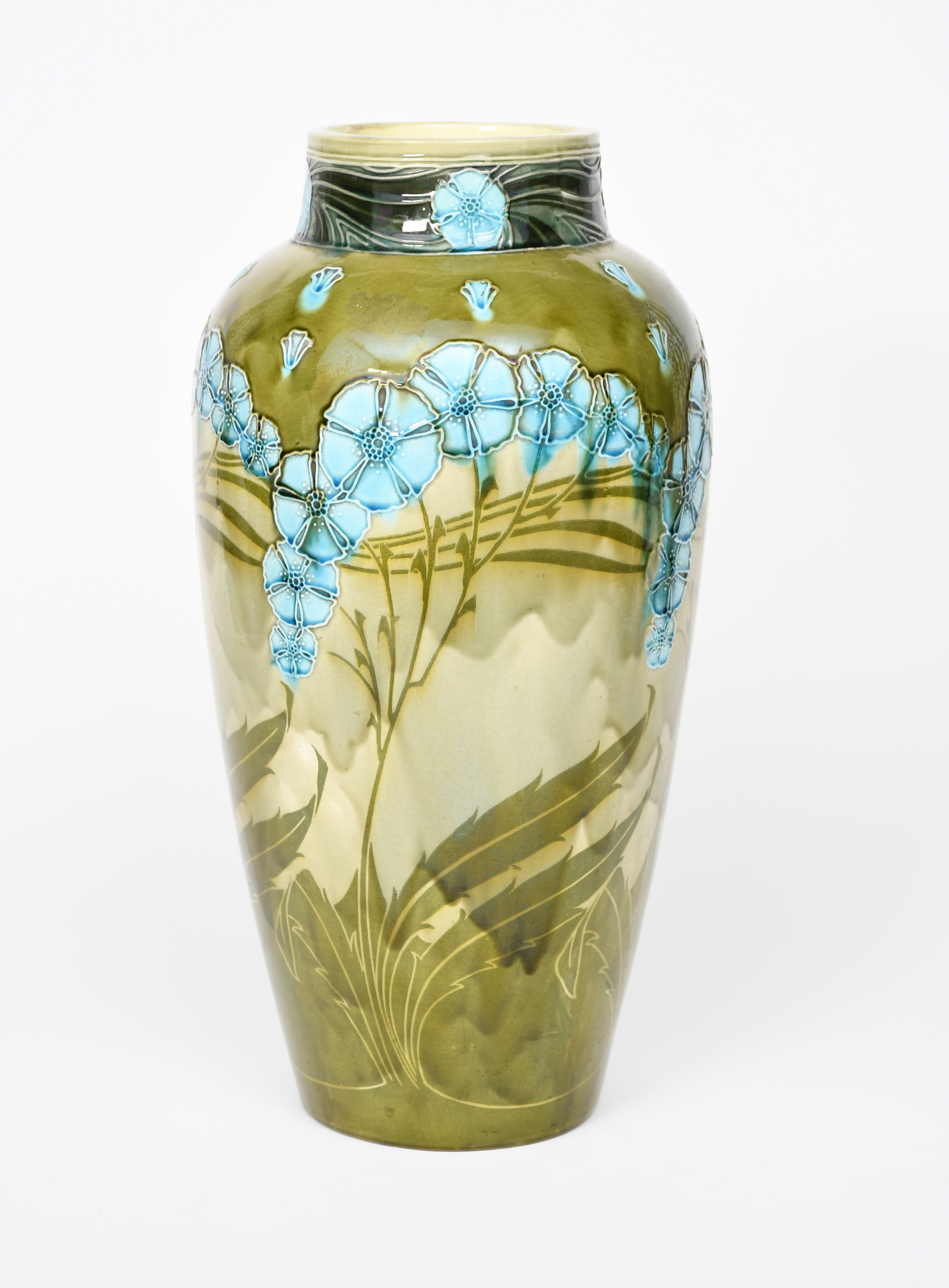 A Minton Secessionist pottery floor vase designed by Leon Solon and John Wadsworth, shouldered form, decorated in low relief with stylised flower stems in blue and green on a pale green ground incised number, impressed marks and printed Minton mark, stress lines to the neck, 47cm. high