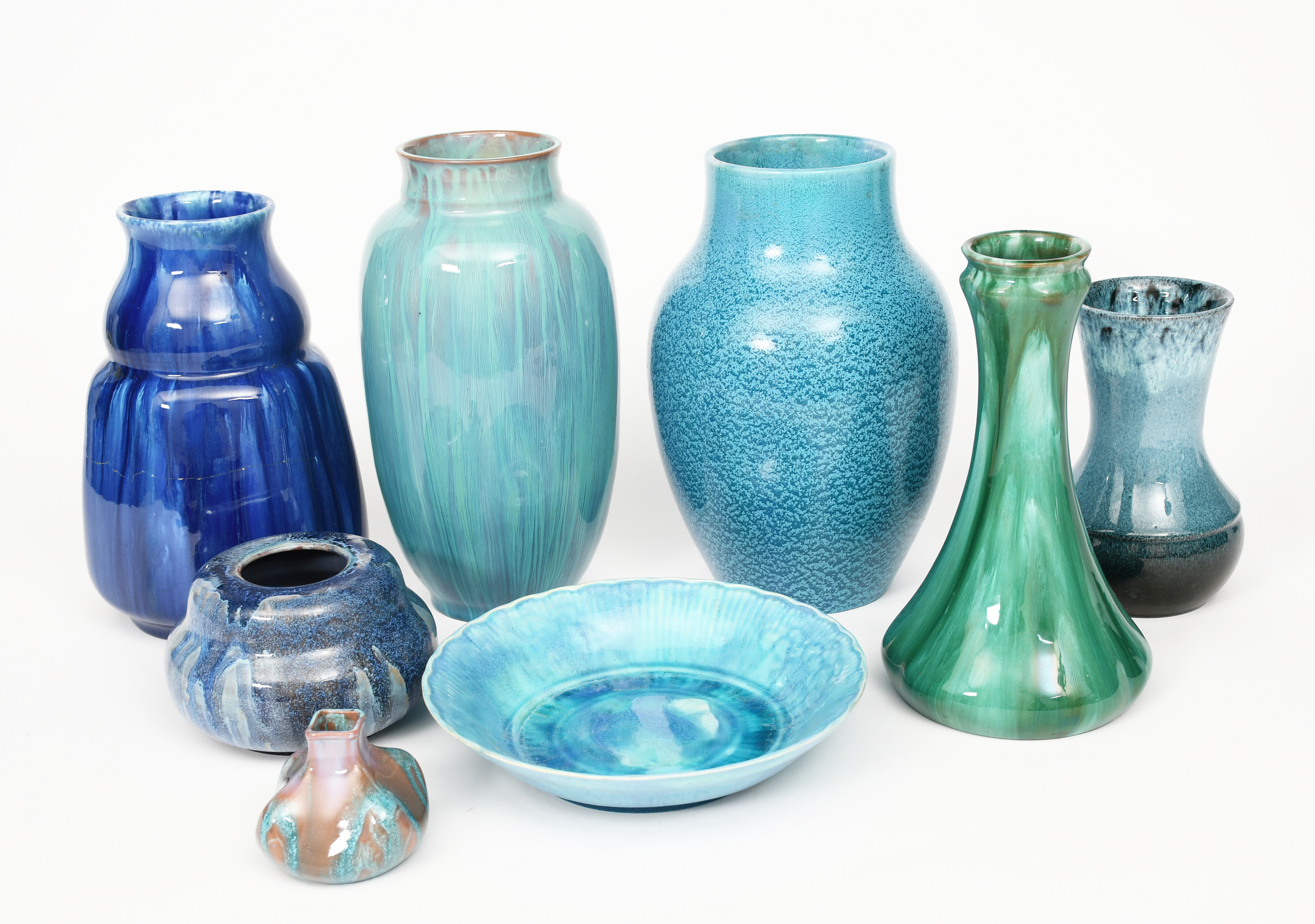 A Pilkington's Lancastrian vase, dated 1906, shouldered ovoid form, covered in a streaked lavender glaze, a tall Pilkington's vase with curdled blue glaze, a tall Pilkington's faceted, shouldered vase covered in a blue streaked glaze and five other Pilkington's items impressed marks, 9.5cm. high (8)