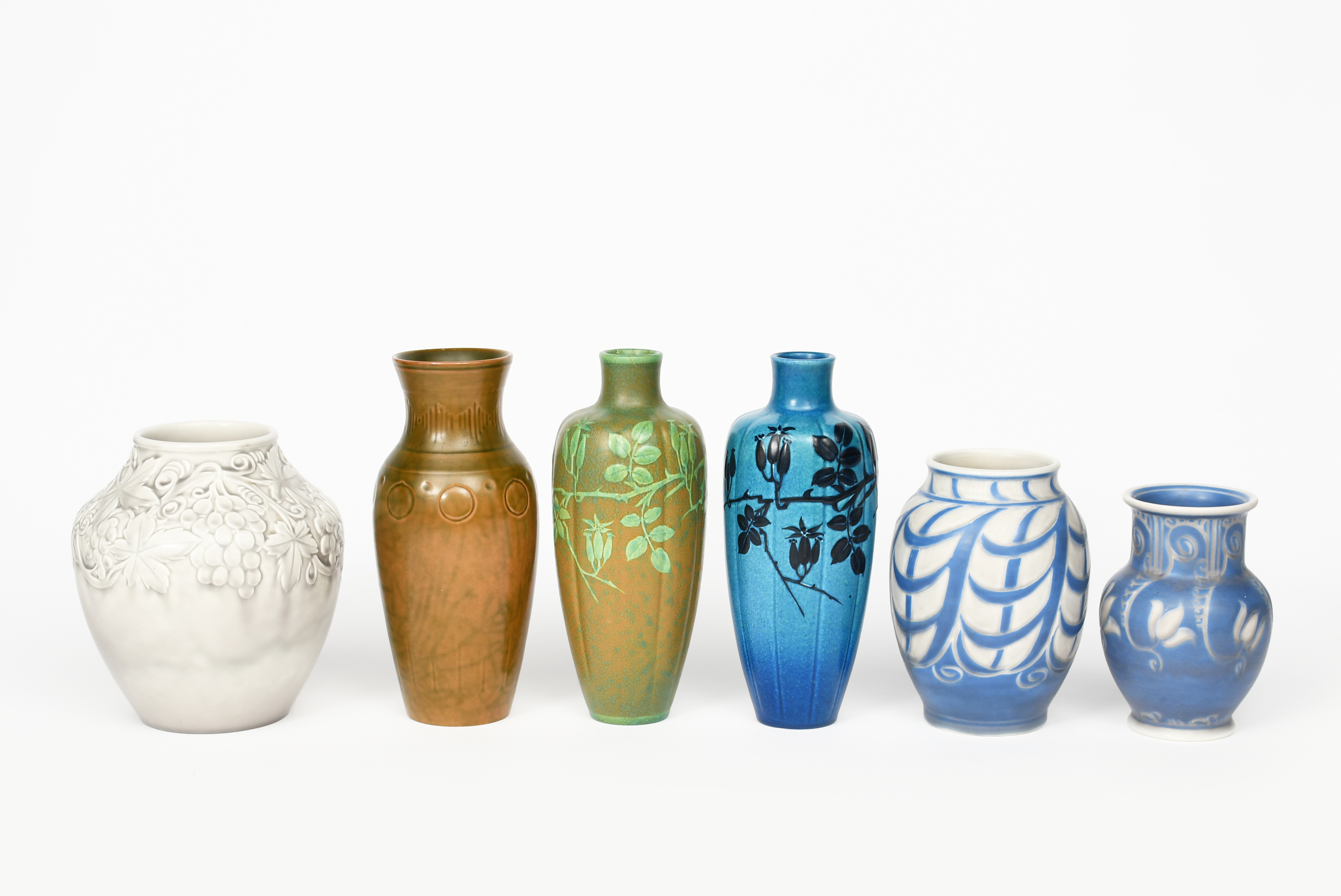 A Pilkington's Lancastrian vase, dated 1912, shouldered ribbed form, painted with rosehip sprays in dark blue on a mottled matt blue ground, another similar covered in a speckled in green, a vase modelled in low relief with fruiting vine by William S Mycock, glazed pale matt grey and three other vases, impressed factory marks, damages, 28cm. high (6)