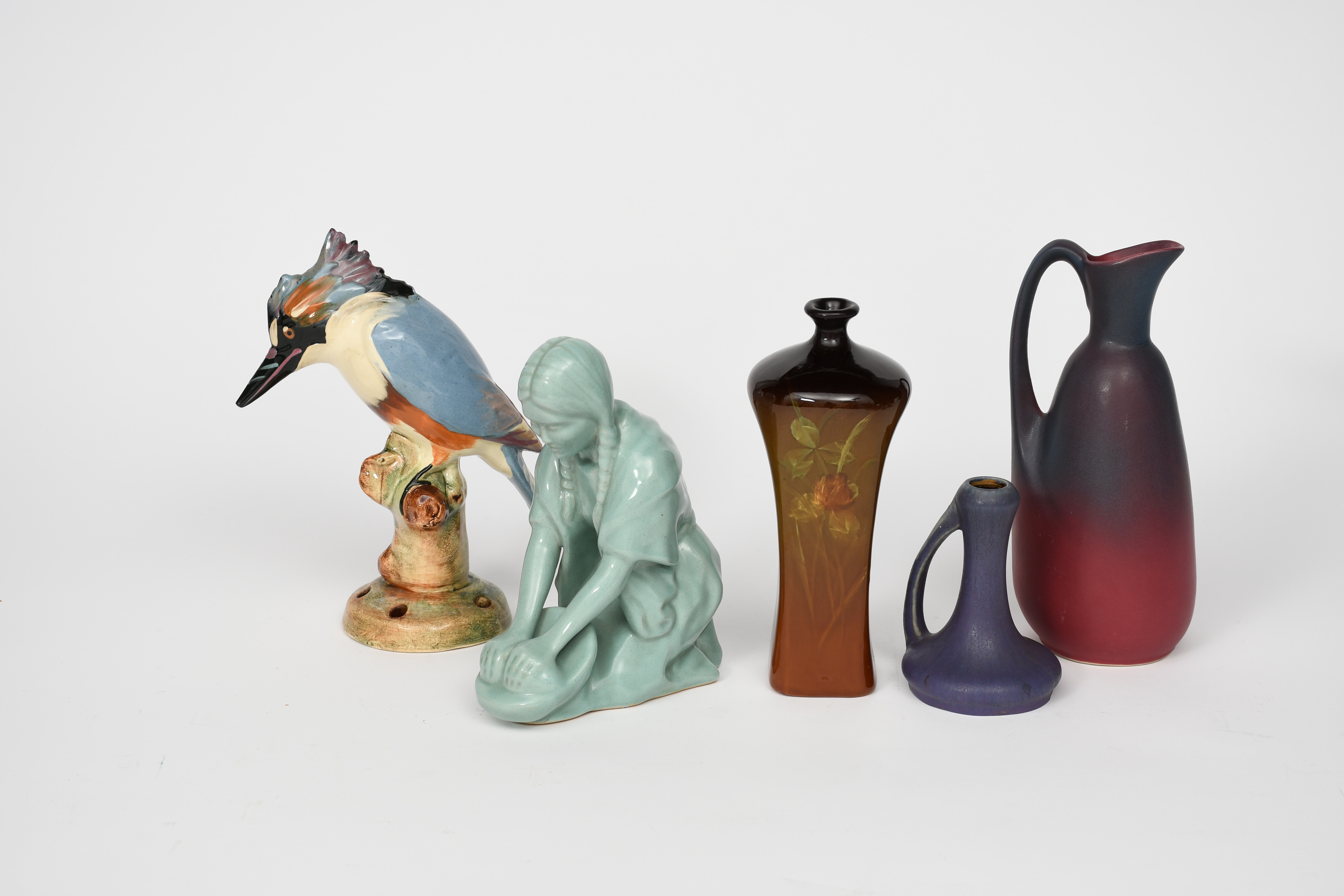 A Van Briggle pottery model of a woman washing, modelled kneeling, covered in a pale blue glaze, a Van Briggle jug, covered in a blue and pink graduated matt glaze, a smaller Fulper Pottery jug covered in a matt purple glaze and a collection of American art pottery, incised marks, 20cm. high (15)