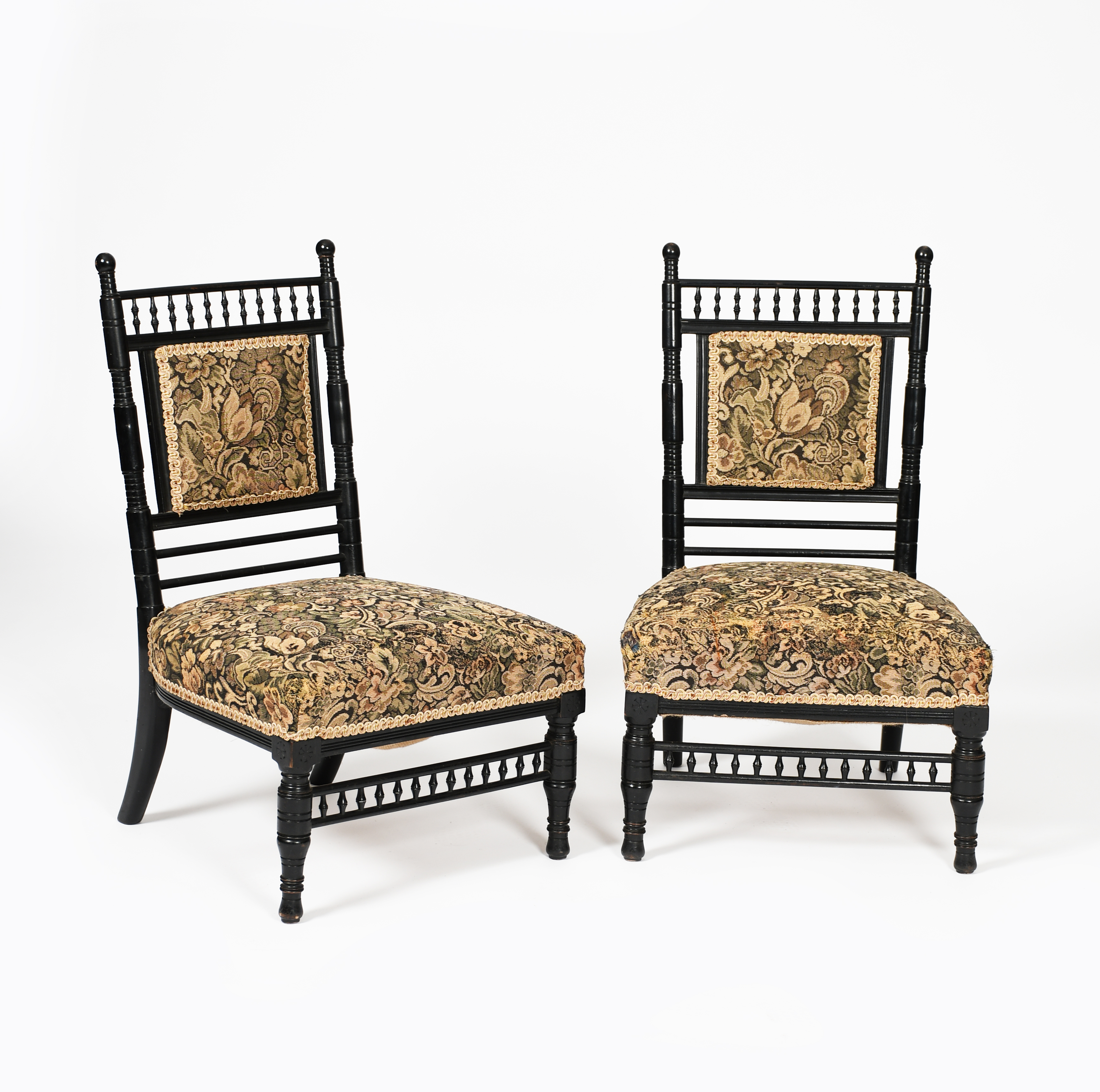 A pair of Aesthetic Movement ebonised wood bedside chairs, with turned bobbin back and front rail, tapestry pads, 73cm. high (2)