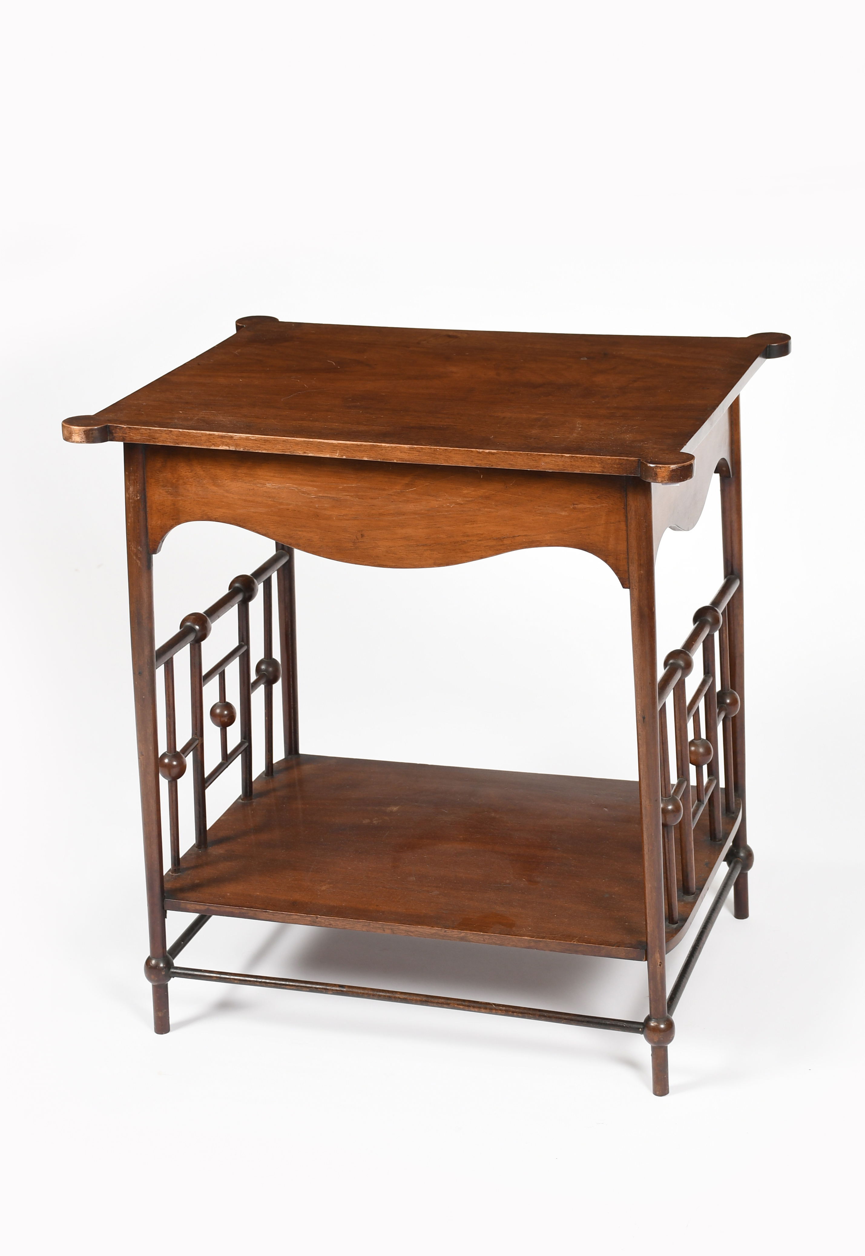 A mahogany occasional table possibly retailed by Goodyers, rectangular top with round corner terminals, on turned legs over rectangular shelf the ends with decorative dowel panels, unsigned, Phillips auctioneer's label, 63 x 48.5 (top), 67cm, high