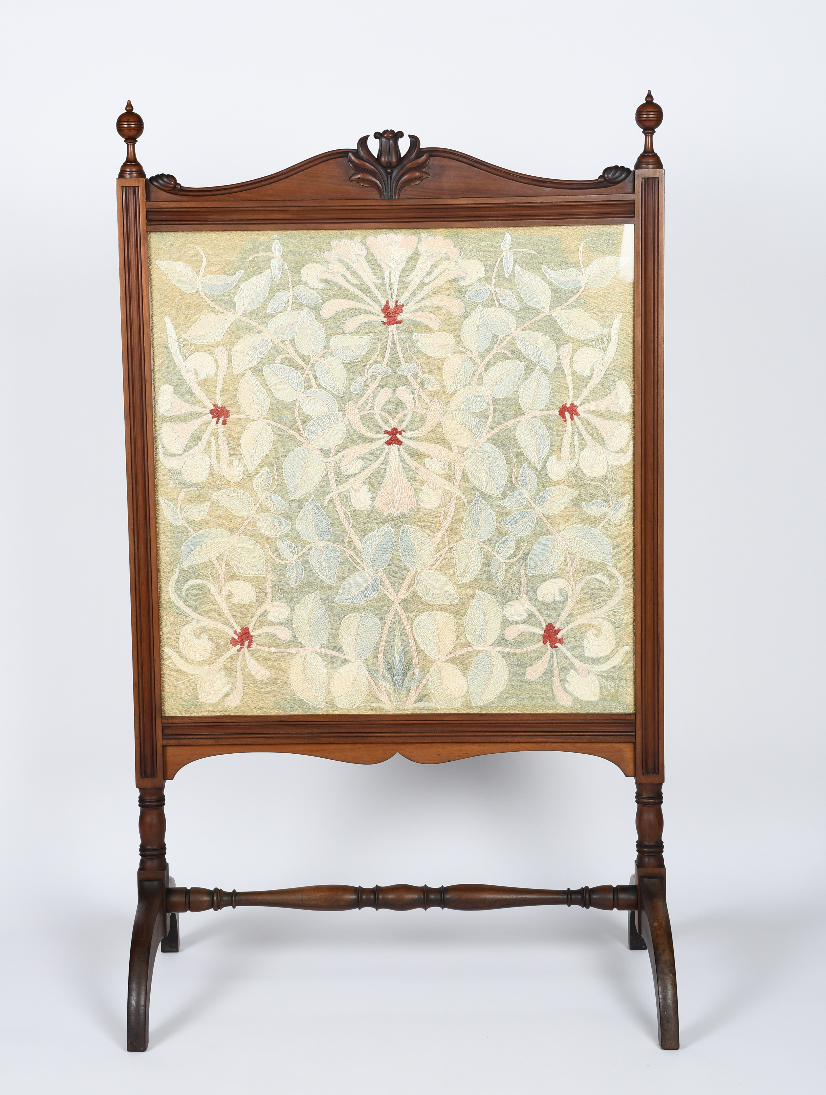 A Morris & Co carved mahogany cheval screen, rectangular with carved flower stem panel and ball finials, on reeded and turned legs with turned stretcher, inset with embroidered silk honeysuckle panel, unmarked, 100cm. high