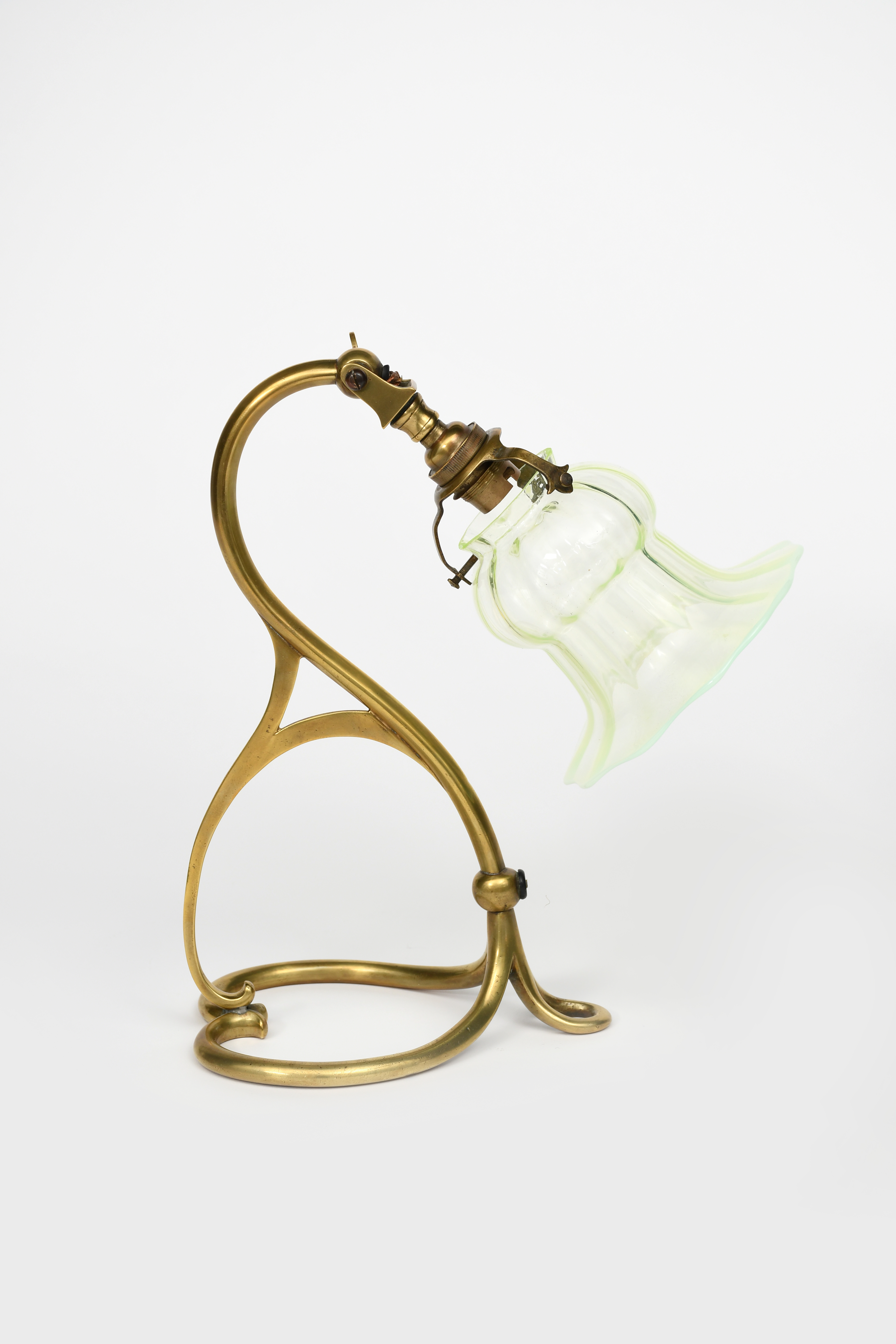 A W A S Benson brass wall/table lamp, with heart-shaped base, elaborate scrolling stem and articulated fitting, vaseline glass shade unsigned, 30cm. high