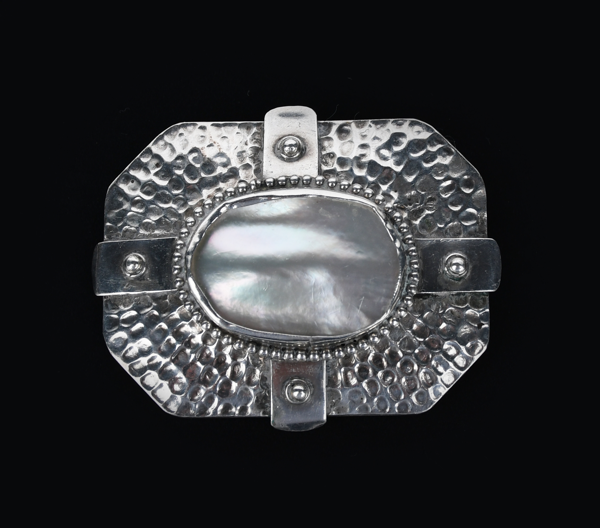 A George Hunt silver and abalone brooch, octagonal hammered frame with strapwork panels, set with central abalone panel in beadwork border stamped GH shield mark, 5cm. wide