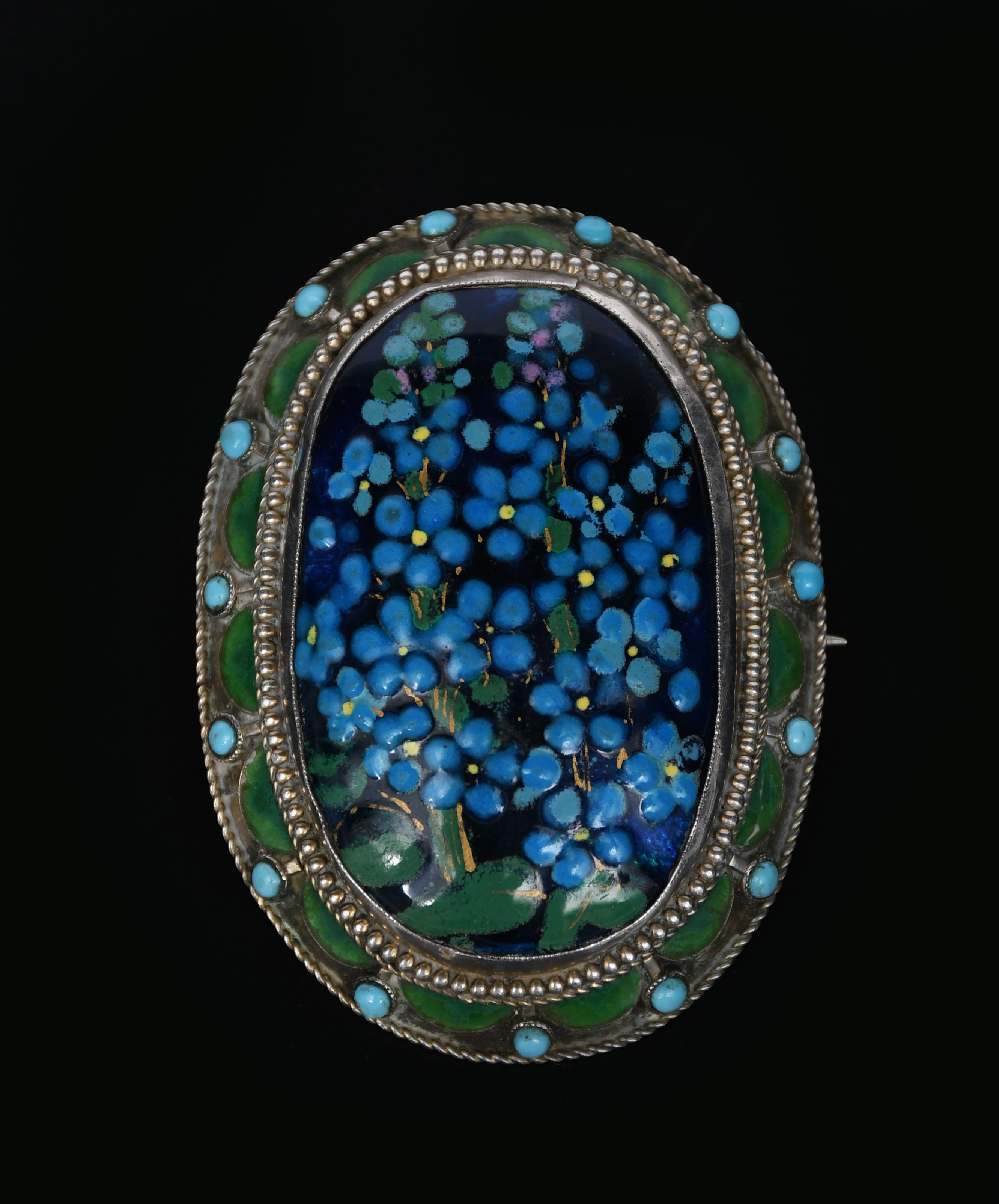 A silver and enamel brooch by George Hunt, dated 1925, the oval frame with central forget me not enamel inside rope borders and enamel and turquoise geometric border, gilt signature G Hunt 1925, 5.5cm.high