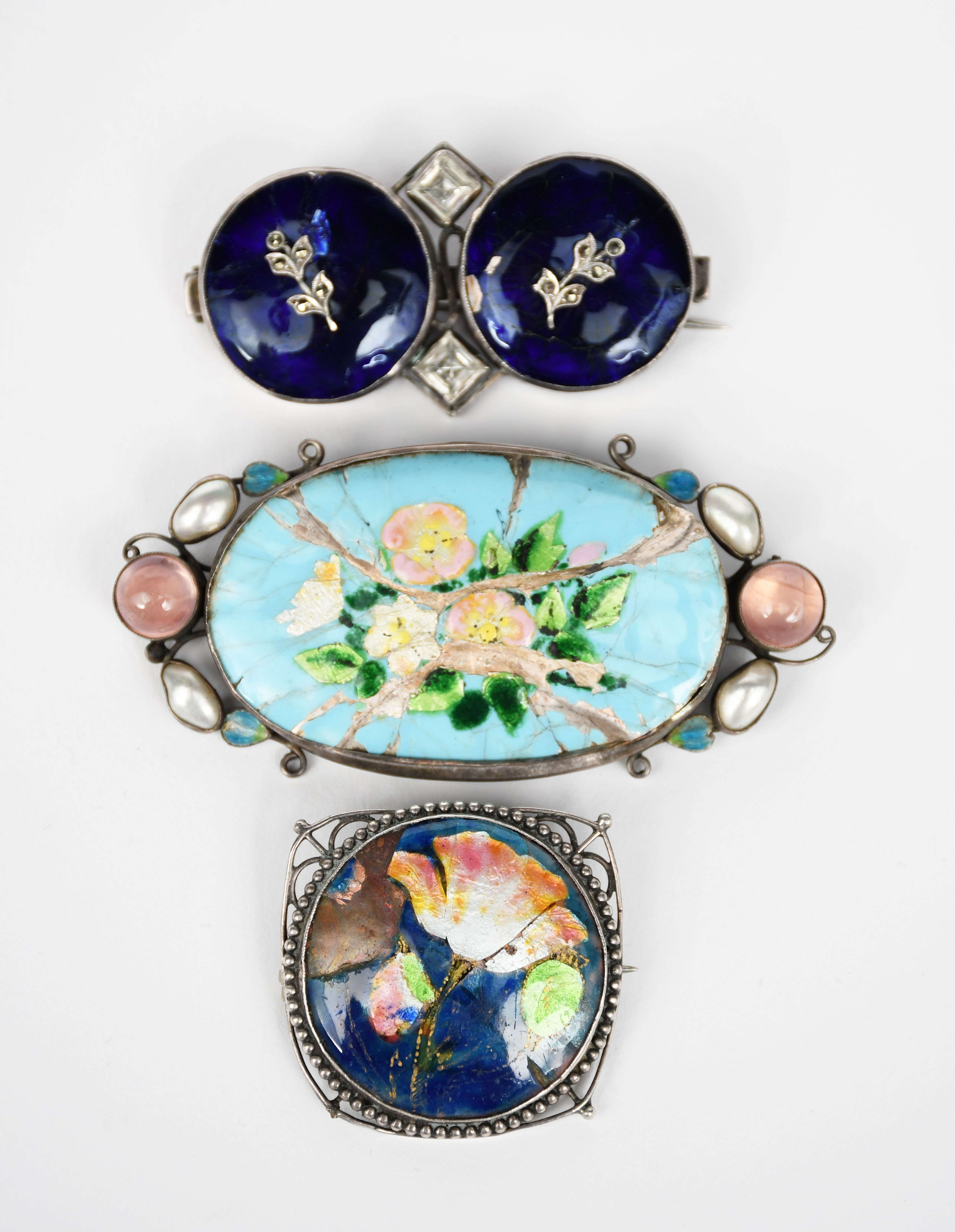 A large George Hunt silver and enamel brooch, oval frame set with rose quartz and abalone shell stones, flanked with blue enamel leaves, the central panel enamelled with a flower bouquet, a smaller George Hunt silver and enamel brooch enamelled with a single flower stem, dated 1937, and another silver and enamel brooch second brooch signed G Hunt and dated 1937, 8cm. long (main brooch), (3)