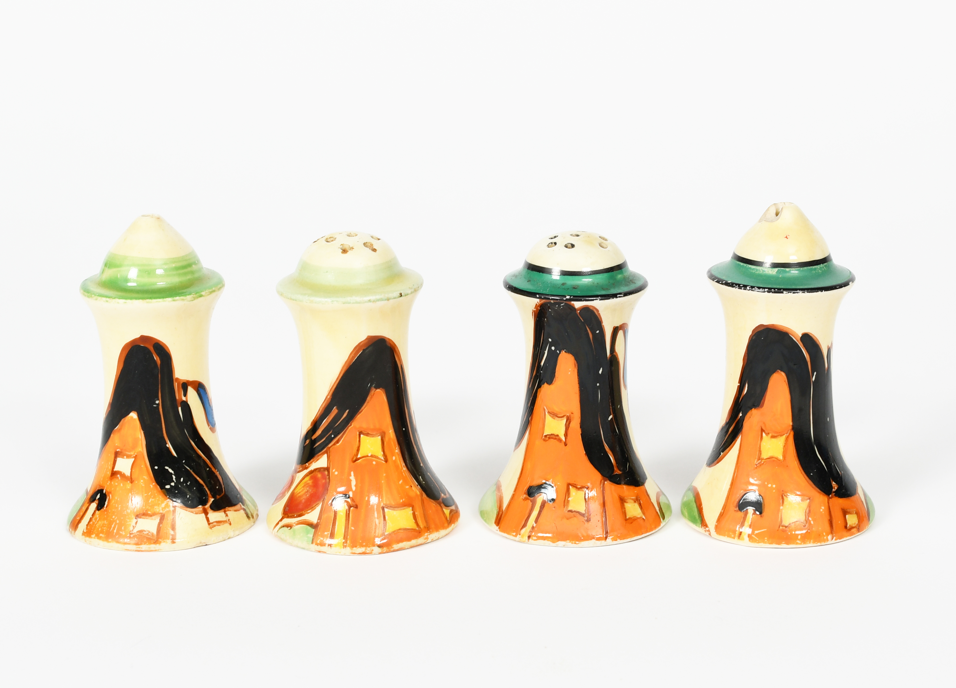 'Orange House' two Clarice Cliff Fantasque Bizarre salt and pepper cruets, painted in colours printed factory marks, chip to salt tip, nicks to one pepper's vents, 7.5cm. high (4)