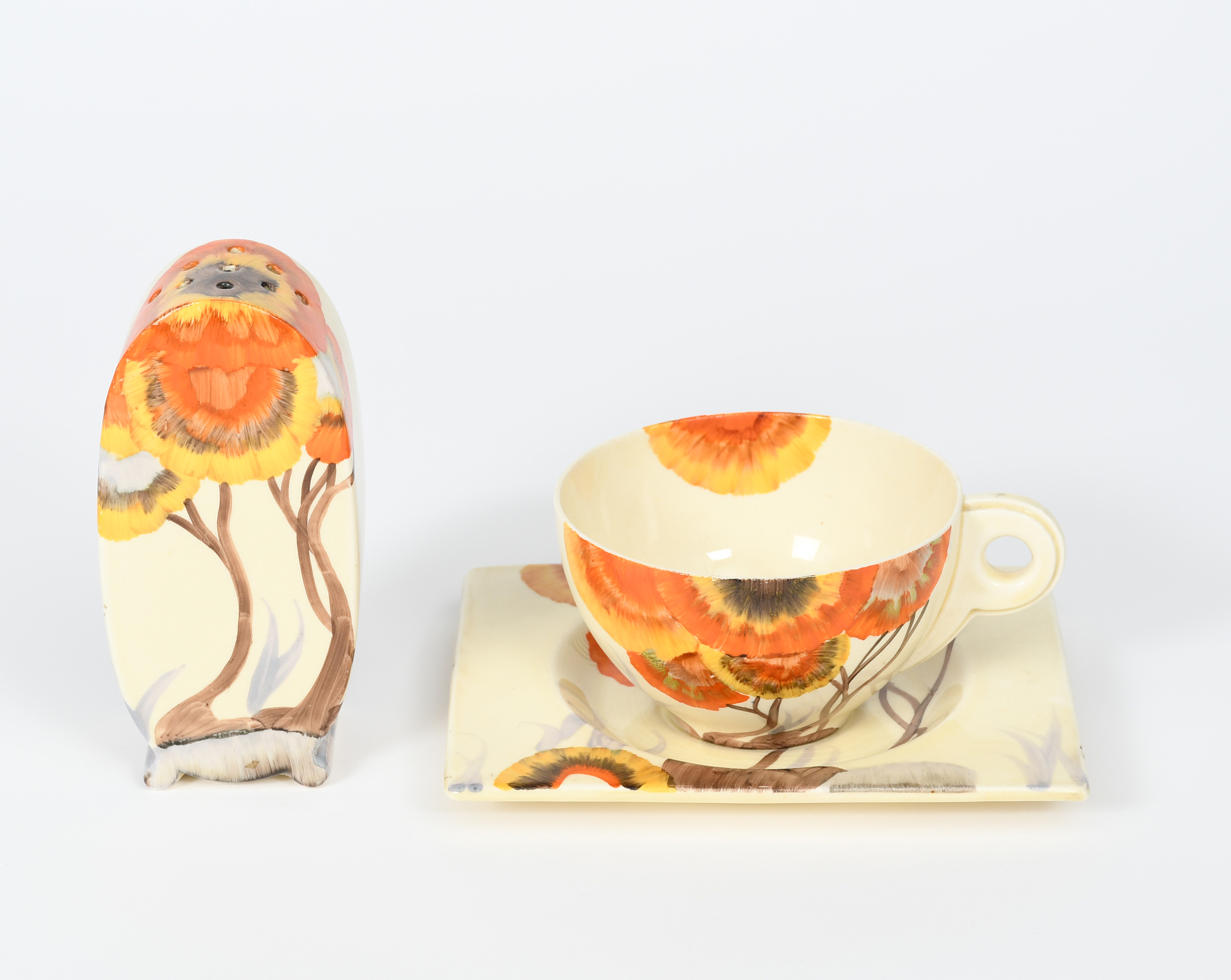 'Rhodanthe' a Clarice Cliff Bon Jour sugar sifter, painted in colours, and a 'Rhodanthe' Clarice Cliff Biarritz tea cup and saucer, printed factory marks, 12.5cm. high, (3)
