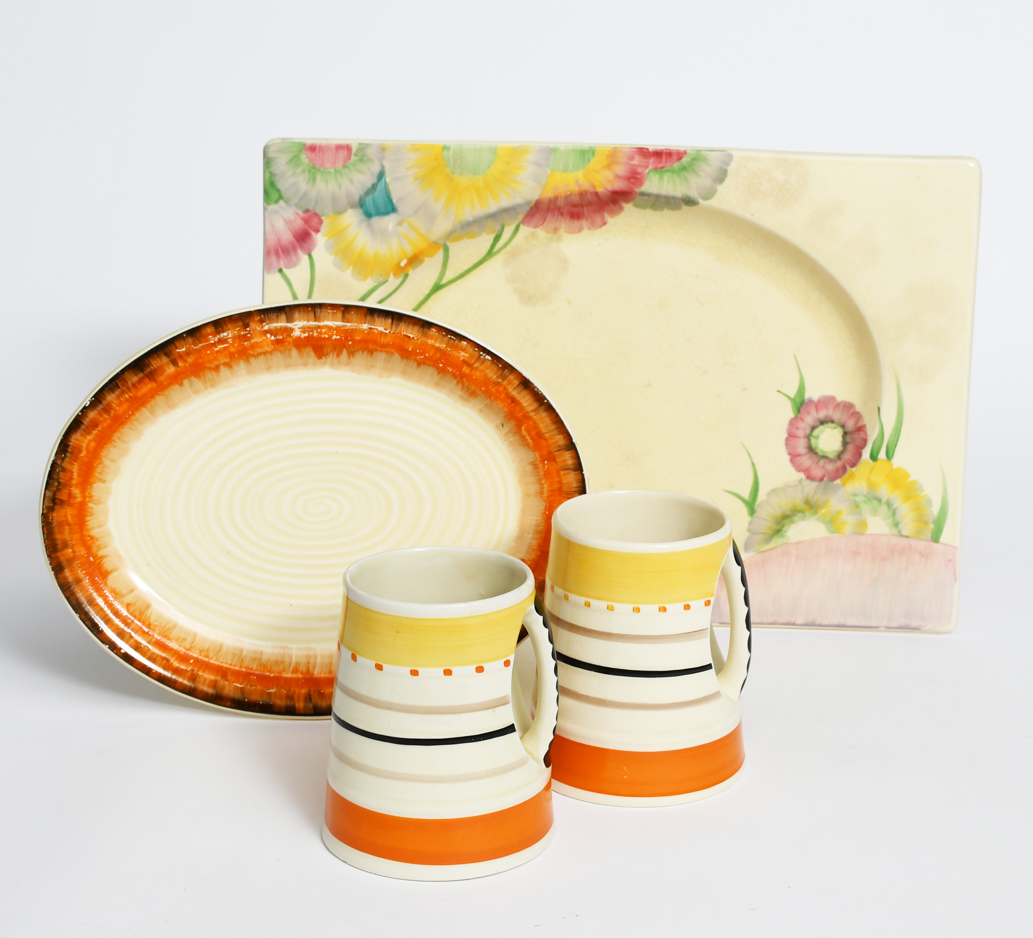'Viscaria' a large Clarice Cliff Biarritz platter, painted in colours, a small Clarice Cliff Lynton platter and two Susie Cooper Productions tankards, painted with yellow and orange bands printed factory mark, 40.5cm. wide (platter), (4)