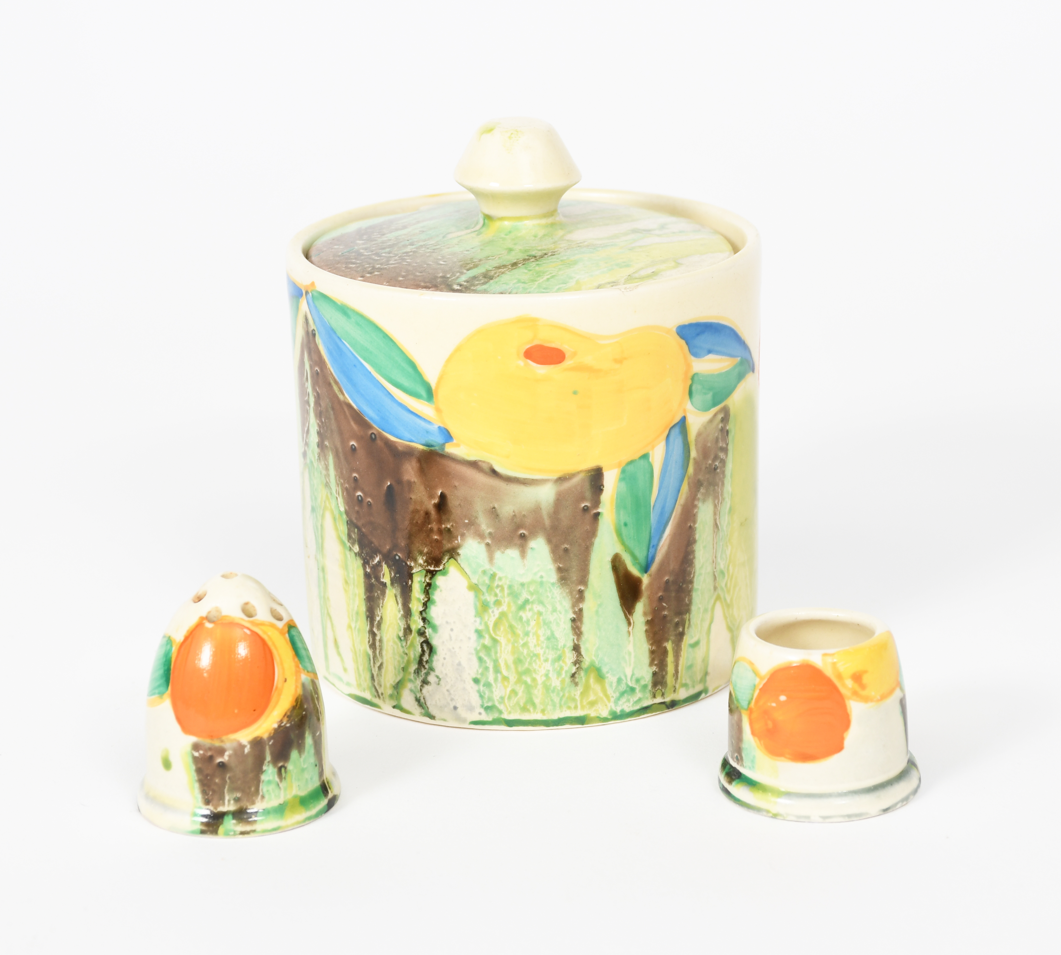 'Delecia Citrus' a Clarice Cliff Bizarre Conical preserve pot and cover, painted in colours, and a 'Delecia Citrus mustard and pepper pot, printed factory marks, 9.5cm. high (3)