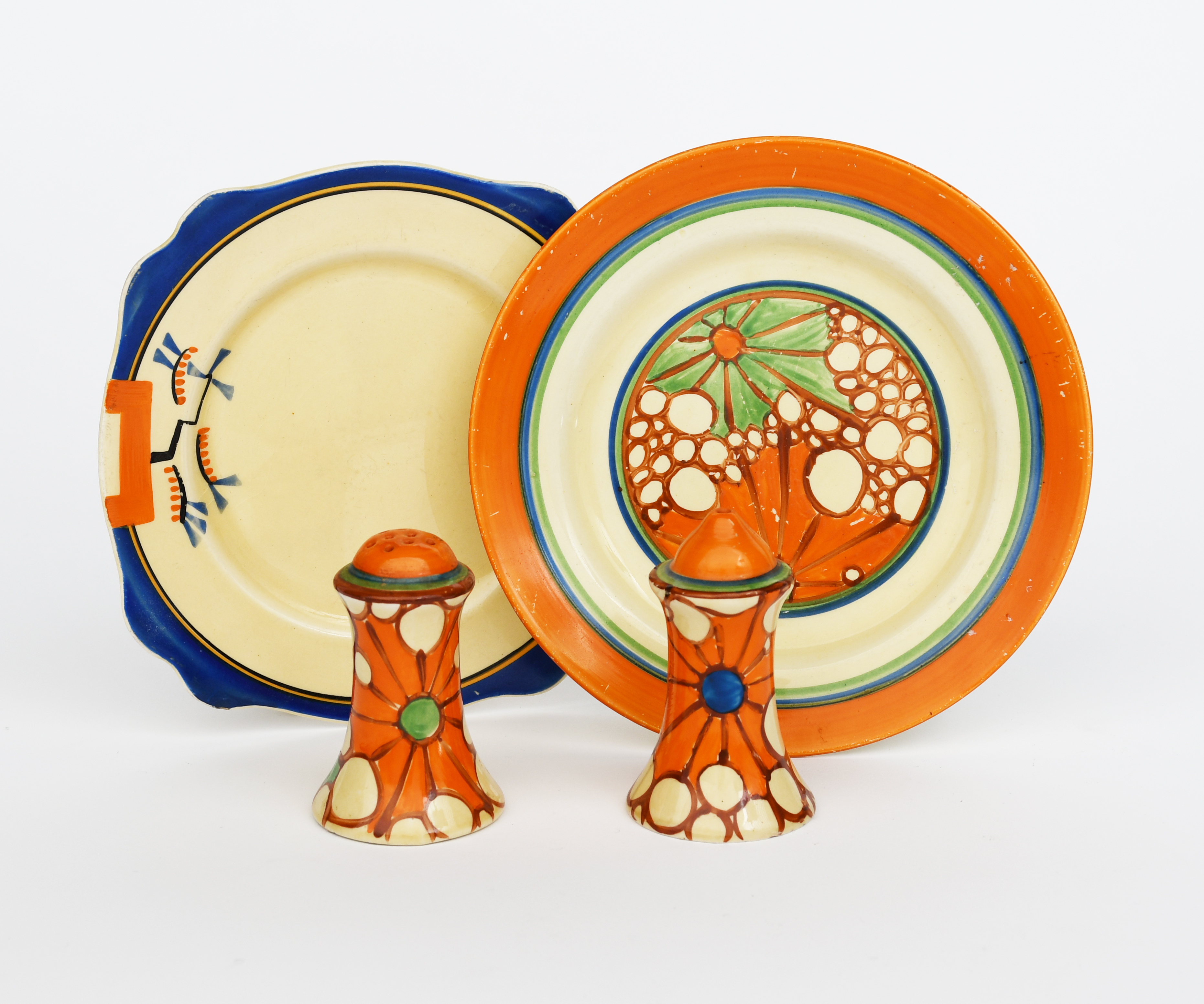 'Broth' a Clarice Cliff Fantasque Bizarre side plate, painted in colours inside green, blue and orange bands, and a blue 'Ravel' Clarice Cliff side plate and a 'Broth' salt and pepper pot printed factory marks, wear, 16.5cm. diam. (4)