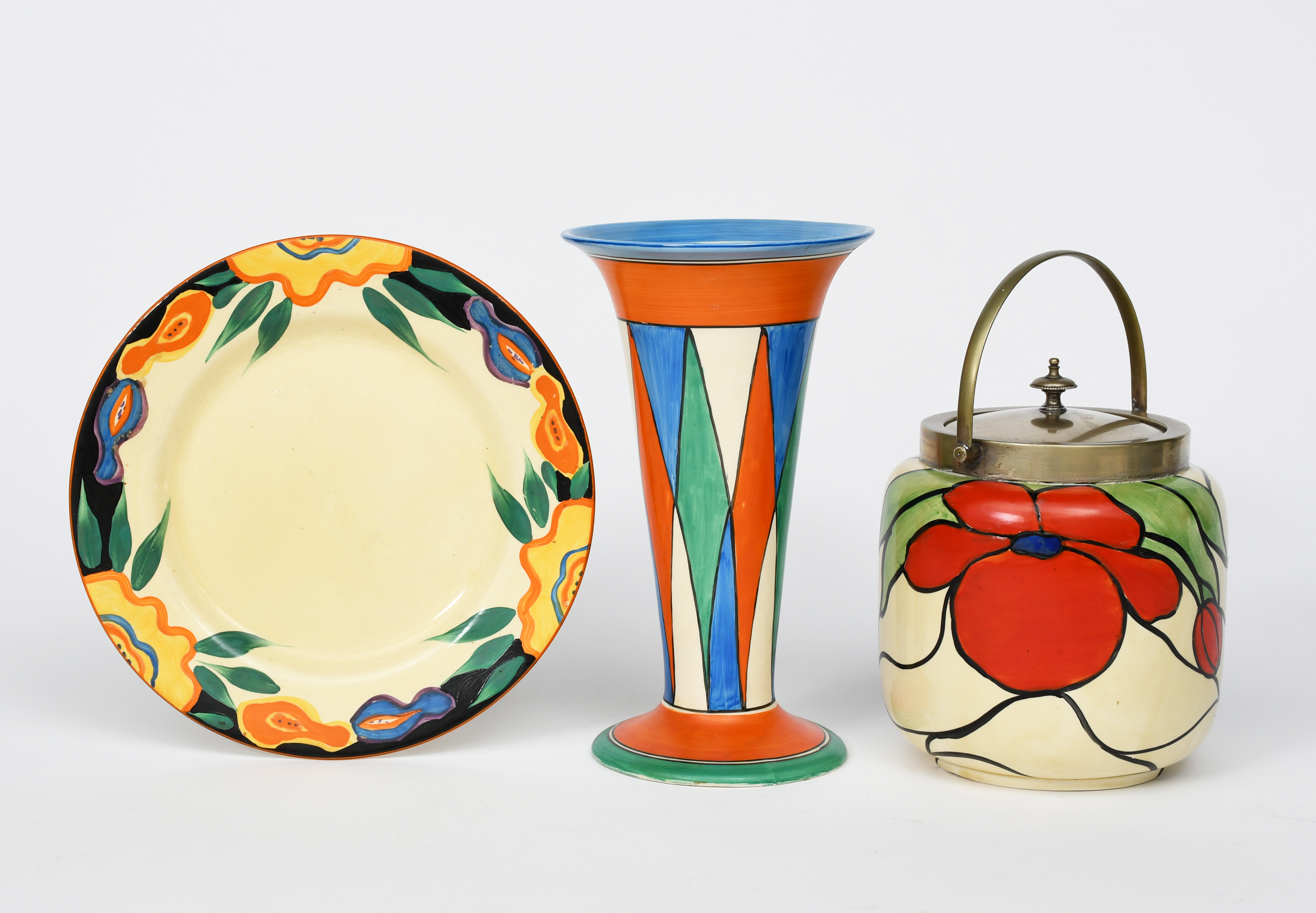 'Original Bizarre' a Clarice Cliff Bizarre trumpet vase, painted with a band of alternating green and orange diamonds, on blue, between orange, green and blue bands, a 'Scarlet Flower' Clarice Cliff biscuit barrel with electroplated cover and a Garland plate, printed factory marks, professional restoration to foot, 22.5cm. high (vase), (4)
