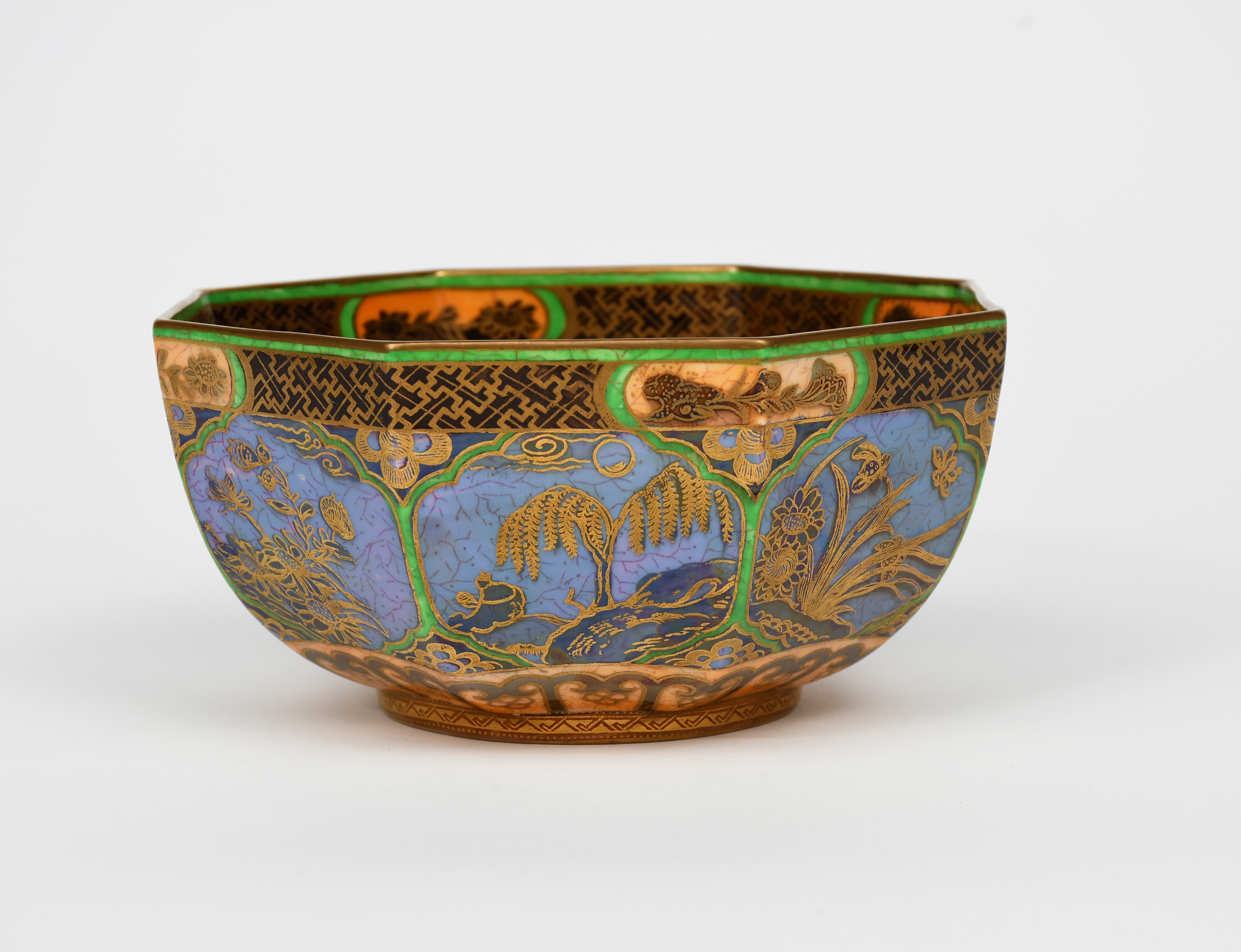 'Willow' a Wedgwood Fairyland lustre bowl designed by Daisy Makeig-Jones, pattern no.Z8418, the octagonal bowl printed and painted in colours and gilt on a blue lustre ground, the interior on a mottled orange ground, printed and painted factory marks, 16cm. diam.