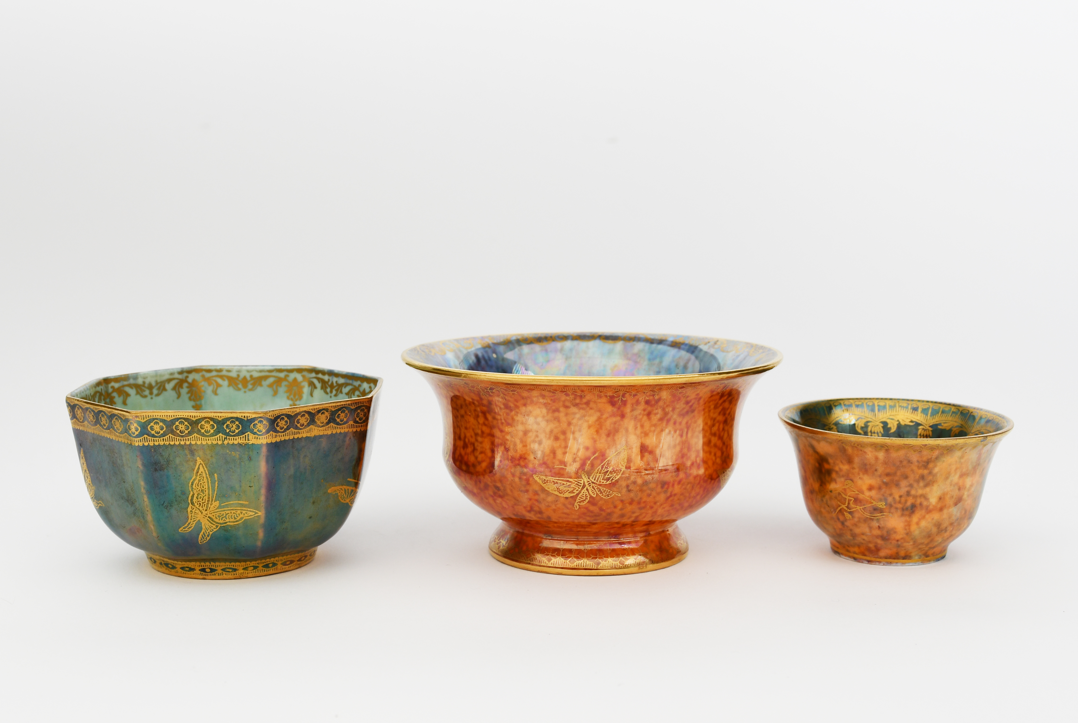 A Wedgwood Butterfly lustre bowl designed by Daisy Makeig-Jones, footed, flaring form, printed in gilt on a mottled orange lustre with butterflies to the exterior, the interior with blue lustre ground, a Wedgwood miniature bowl printed with Chinese symbols and a Wedgwood octagonal bowl printed with butterflies printed and painted factory marks, 11.5cm. diam. (3)