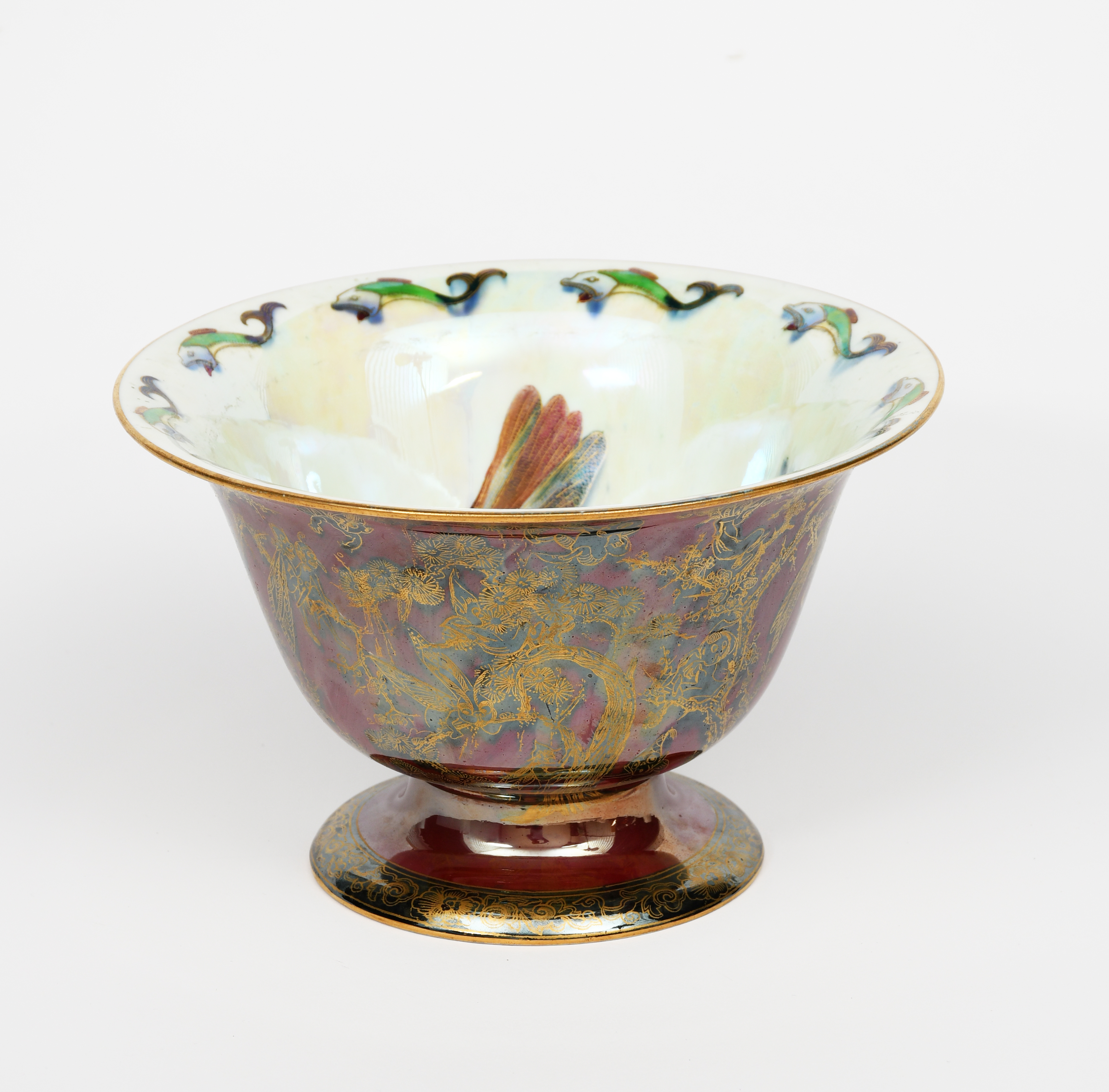 'Firbolgs III' a Wedgwood Fairyland lustre Antique Centre bowl designed by Daisy Makeig-Jones, printed in black and gilt on a red lustre ground, the interior pearl lustre printed factory mark, 22cm. diam, 14cm high.
