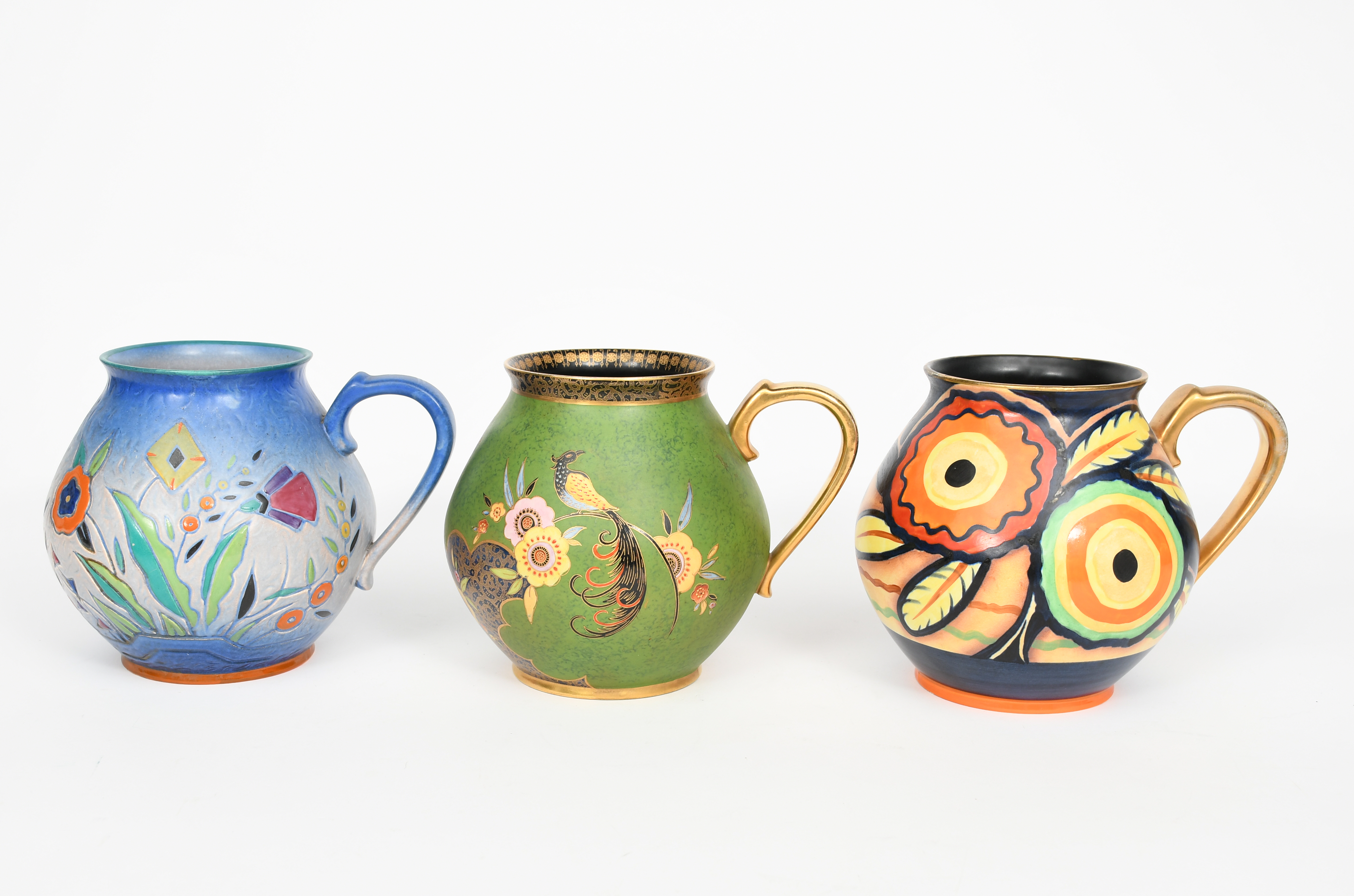 A Carlton Ware Handcraft single-handled jug, pattern number 3581, painted with geometric flowers in colours on a matt yellow ground, highlighted in gilt, another pattern incised and painted with geometric flowers and another in the 'Feather tailed Bird and Flower' pattern printed and painted marks, 17cm. high, (3)