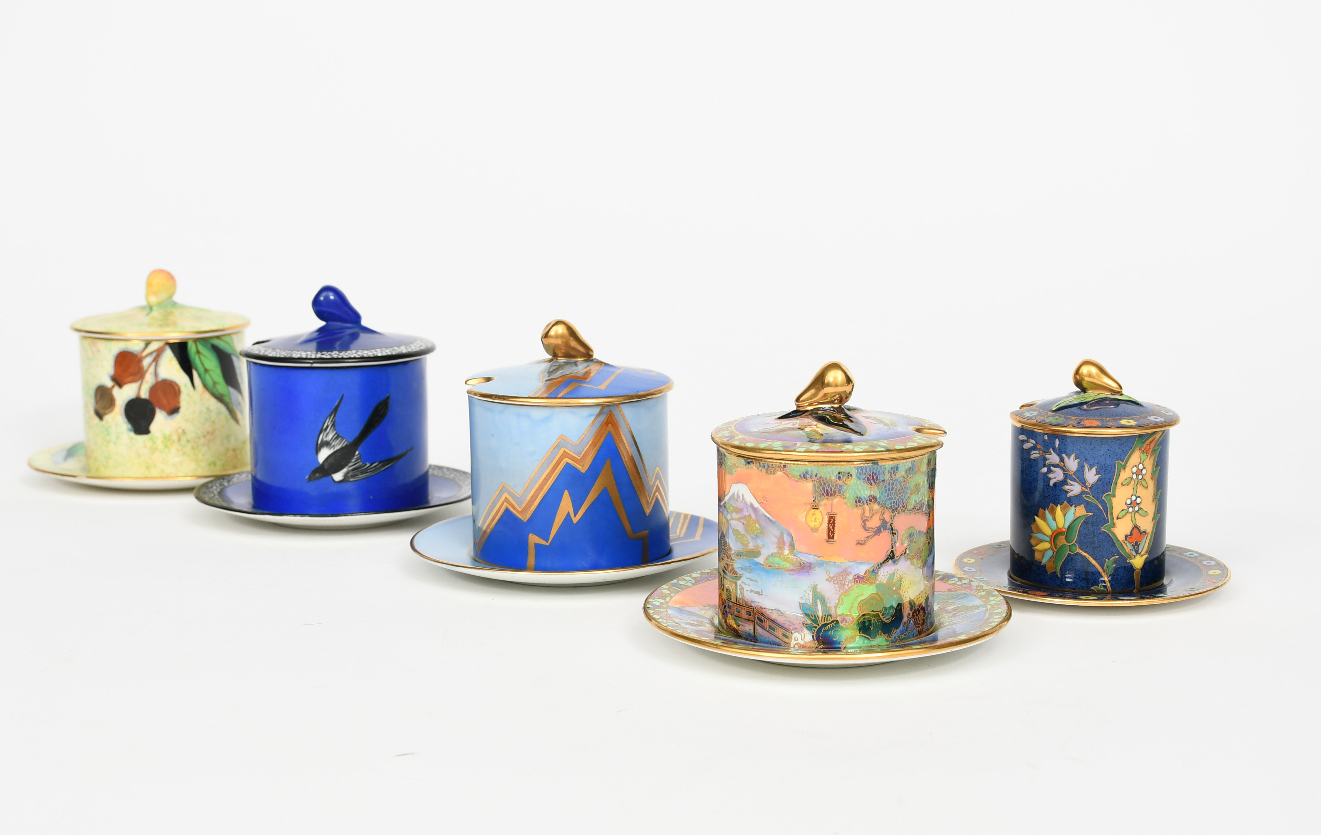 'Chinaland' a Carlton Ware preserve pot, cover and saucer, pattern no.2948, printed and painted in colours and gilt on an orange ground, another preserve pot, cover and saucer in the 'Gum Flower' patter, another in the 'Zig Zag' pattern and two other preserve pot, cover and saucers, printed and painted factory marks, hairline to Gum Flower cover, 9.5cm. high (15)