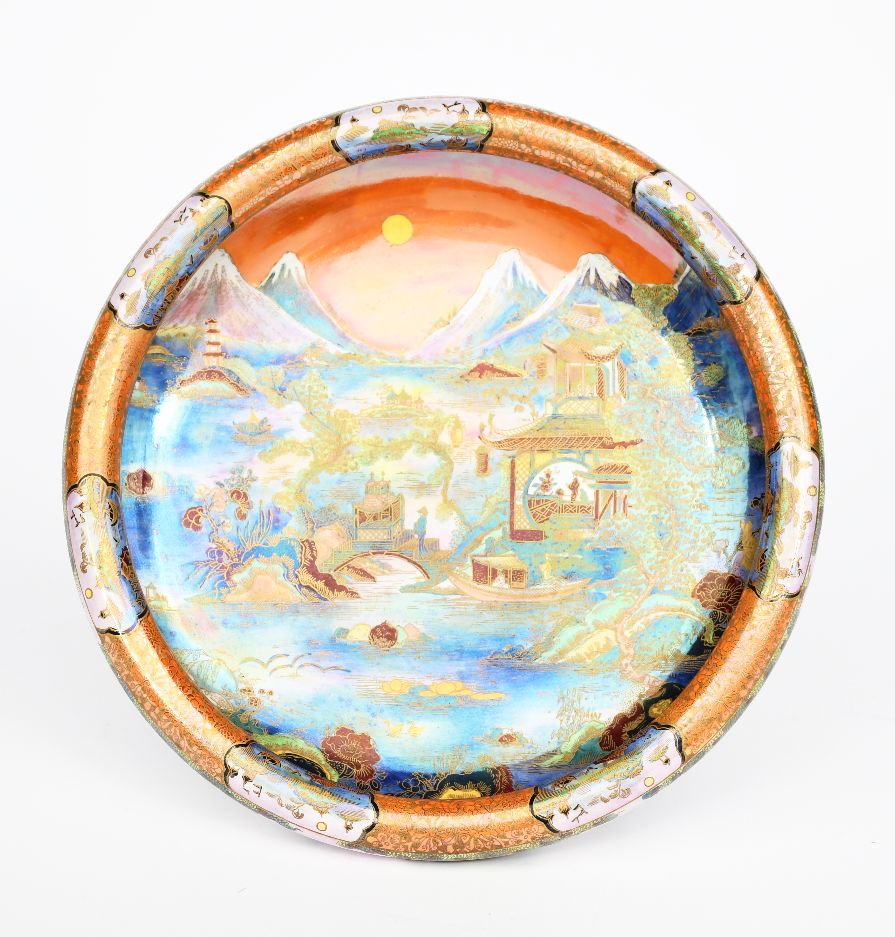 'Chinaland' an Art Deco Carlton Ware floating bowl, pattern no.2948, printed and painted in colours and gilt with a Chinese pagoda landscape, mountains in the distance, on an orange lustre ground, printed and painted factory marks, 31cm. diam.