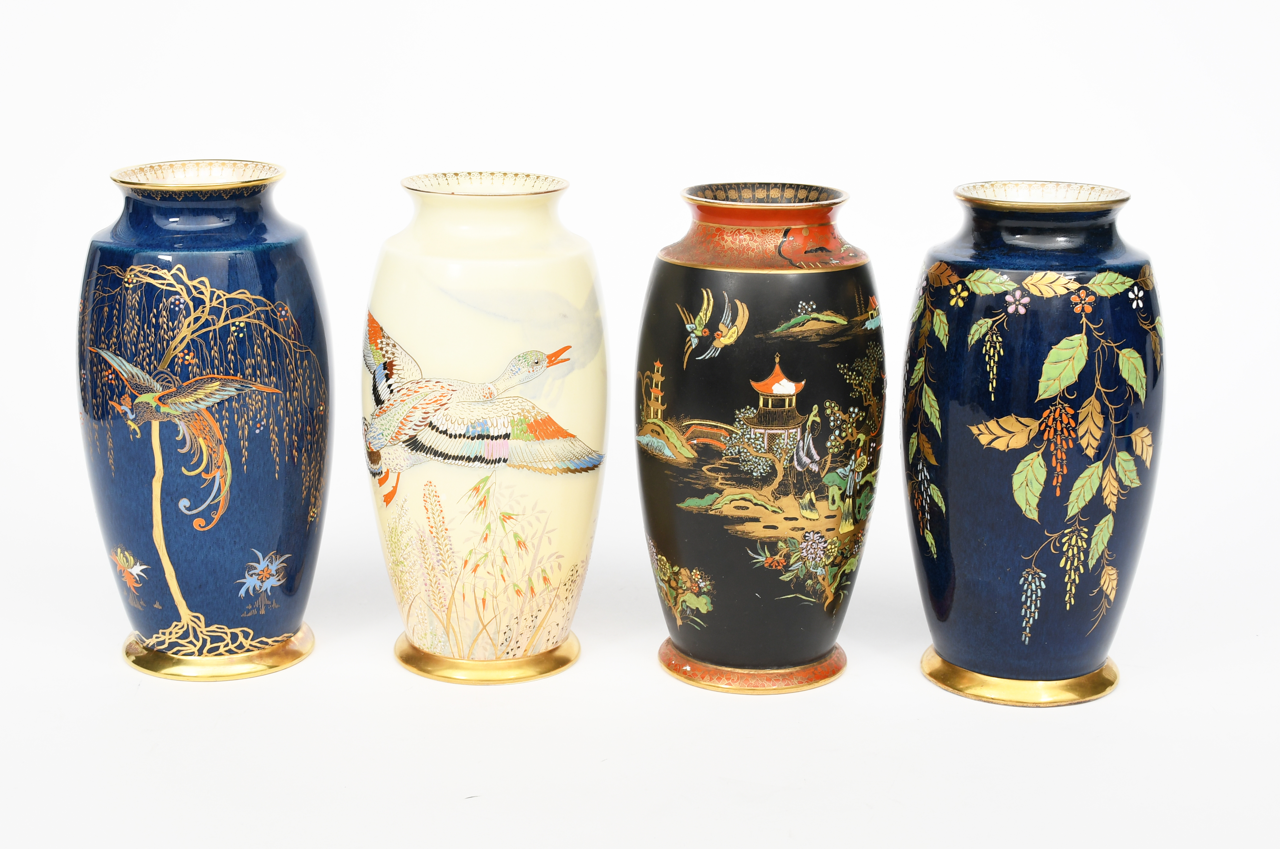 'Chinese Bird and Tree' a Carlton Ware vase, pattern no.4118, a Carlton Ware 'Wild Duck' vase, a Carlton Ware 'Mikado' vase and another in the 'Leaf' pattern printed and painted factory marks, 26.5cm. high, (4)