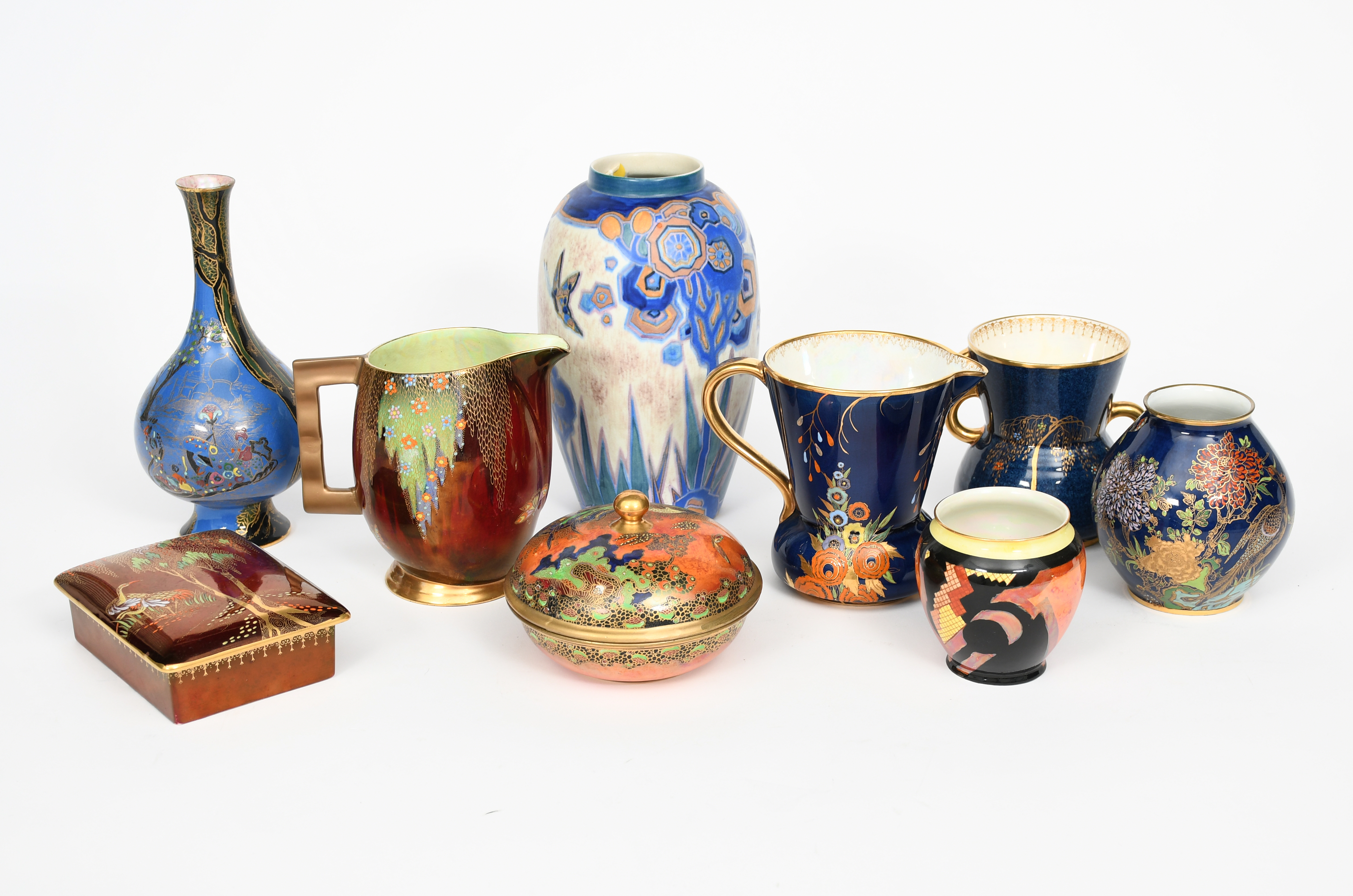 'Eden Canopy' a Carlton Ware Moderne jug, printed and painted in colours and gilt on a red lustre ground, another jug similar, a Carlton Ware 'Paradise Bird tree and Cloud' powder box and cover, Carlton Ware ovoid vase, pattern 3502, a shouldered Handcraft vase and a small collection of Carlton Ware, printed and painted factory marks, restoration and damages, 13cm. high, (a lot)